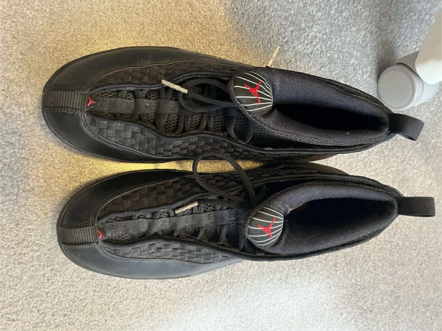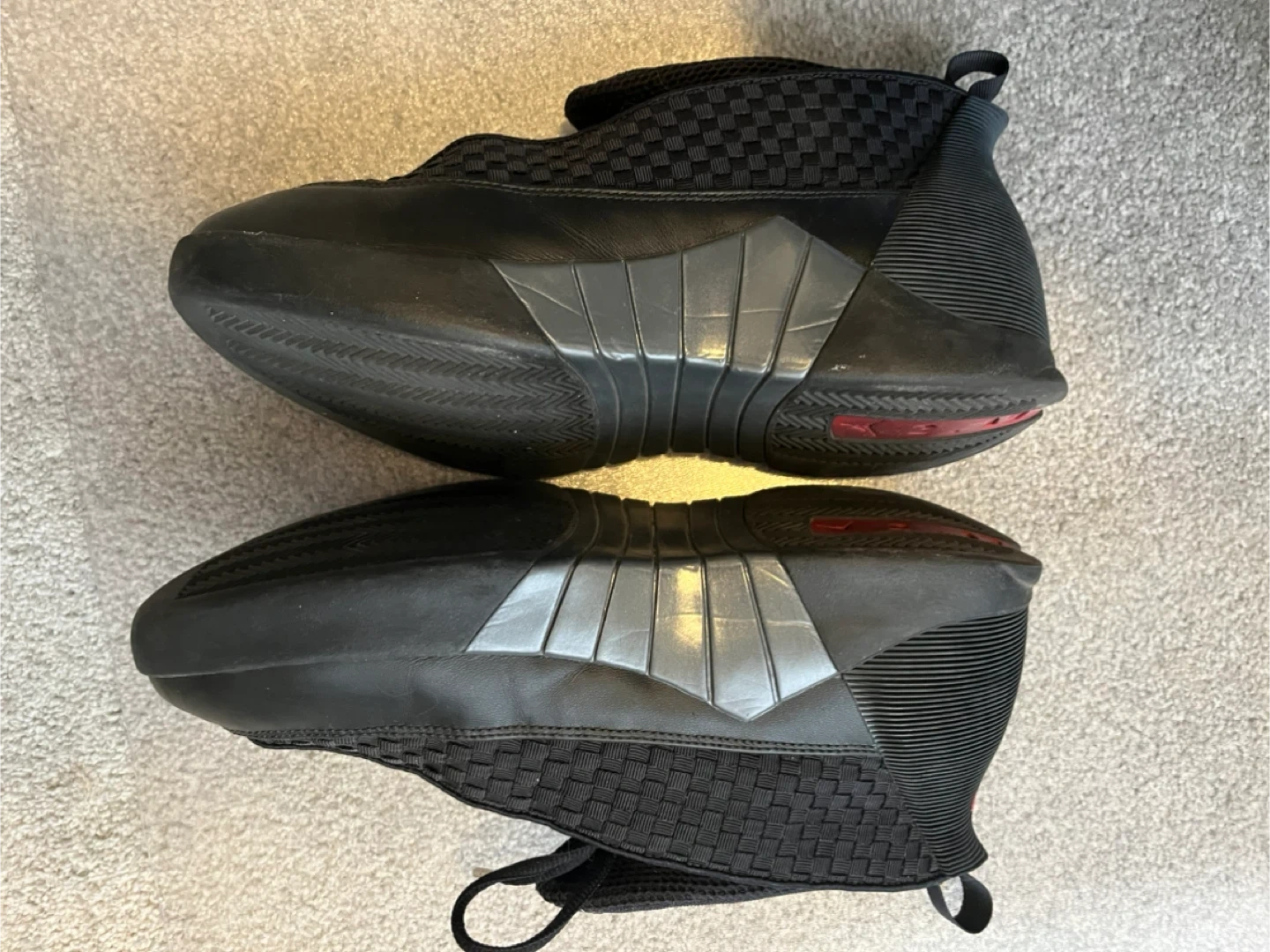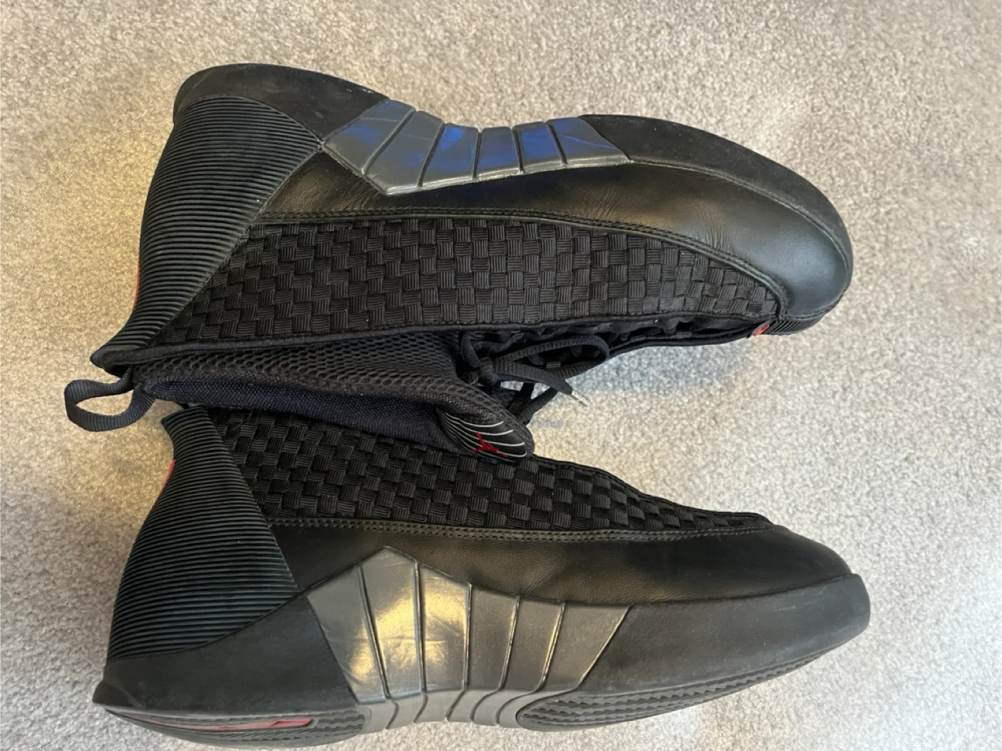Black Air Jordan XV 15 basketball shoes. Features a woven textile upper and ribbed heel detailing. These sneakers offer a distinctive silhouette for any collector.