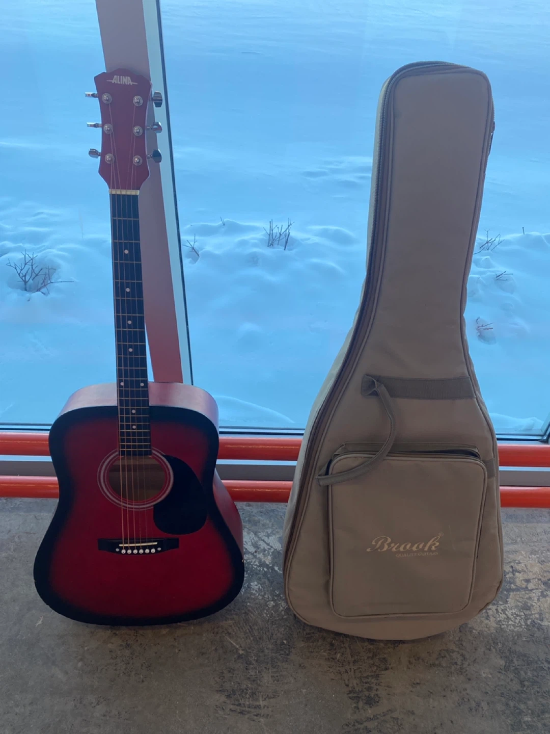 This is an Alina acoustic guitar. It comes with a Brook gig bag for easy transport. Perfect for aspiring musicians!
