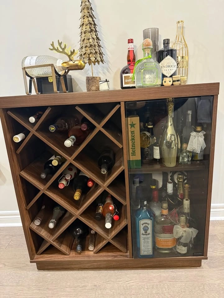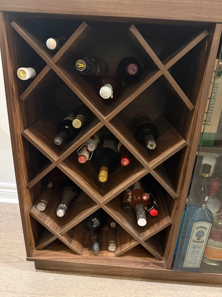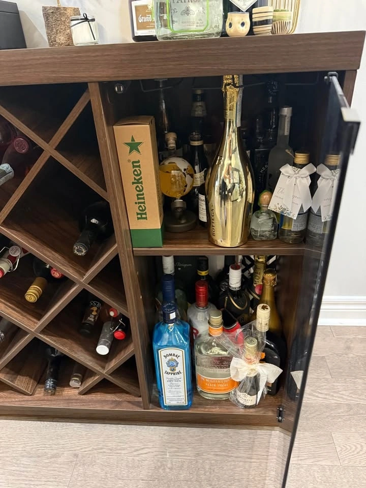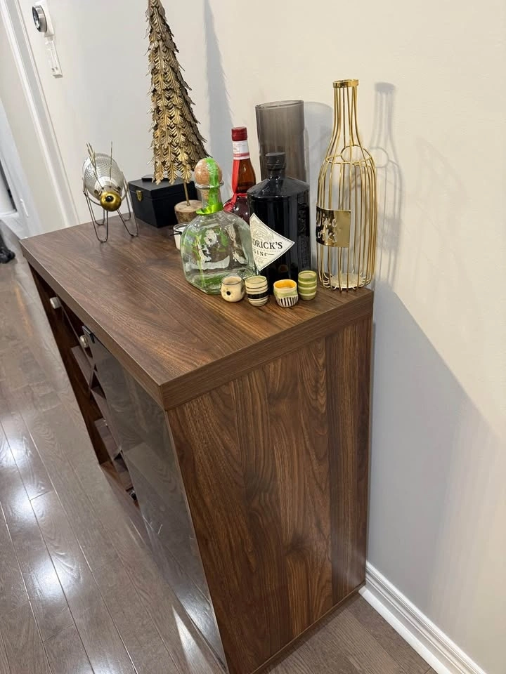 Holds several bottles of wine in designated spots as well as a moveable shelf for hard liquor. Wood with glass door on one side that pushes in to close, and also has rack to hold some wine glasses inside. Can also be used as a sideboard. Dimensions: 34” x 34”. In great condition. Must pick up in Stouffville.