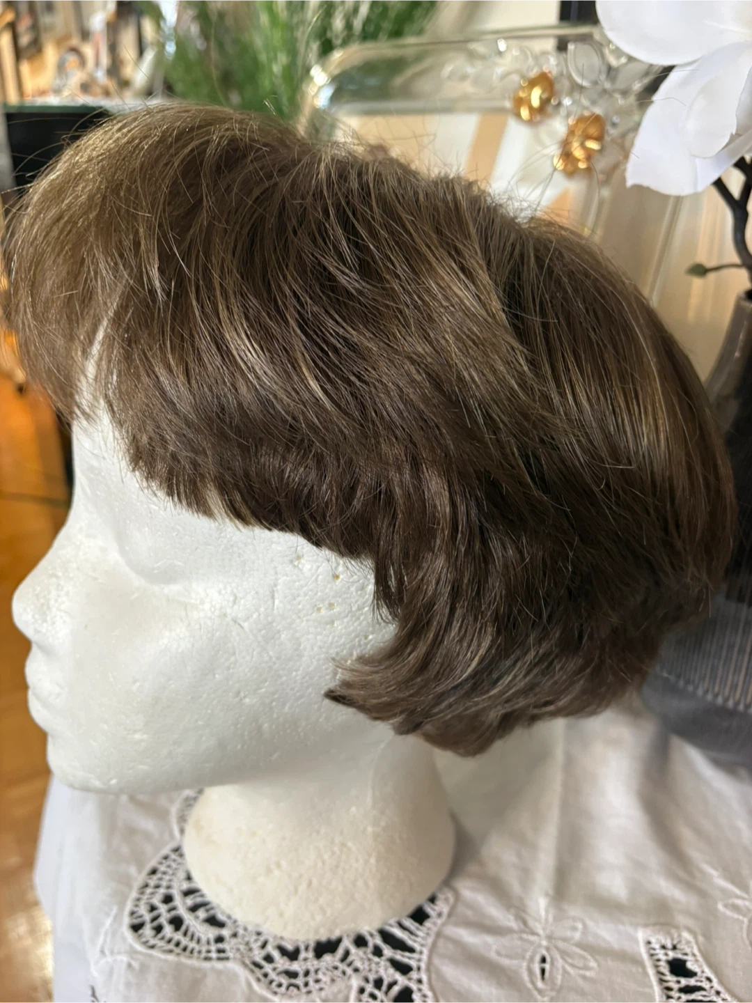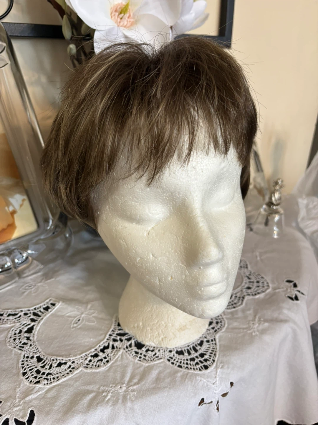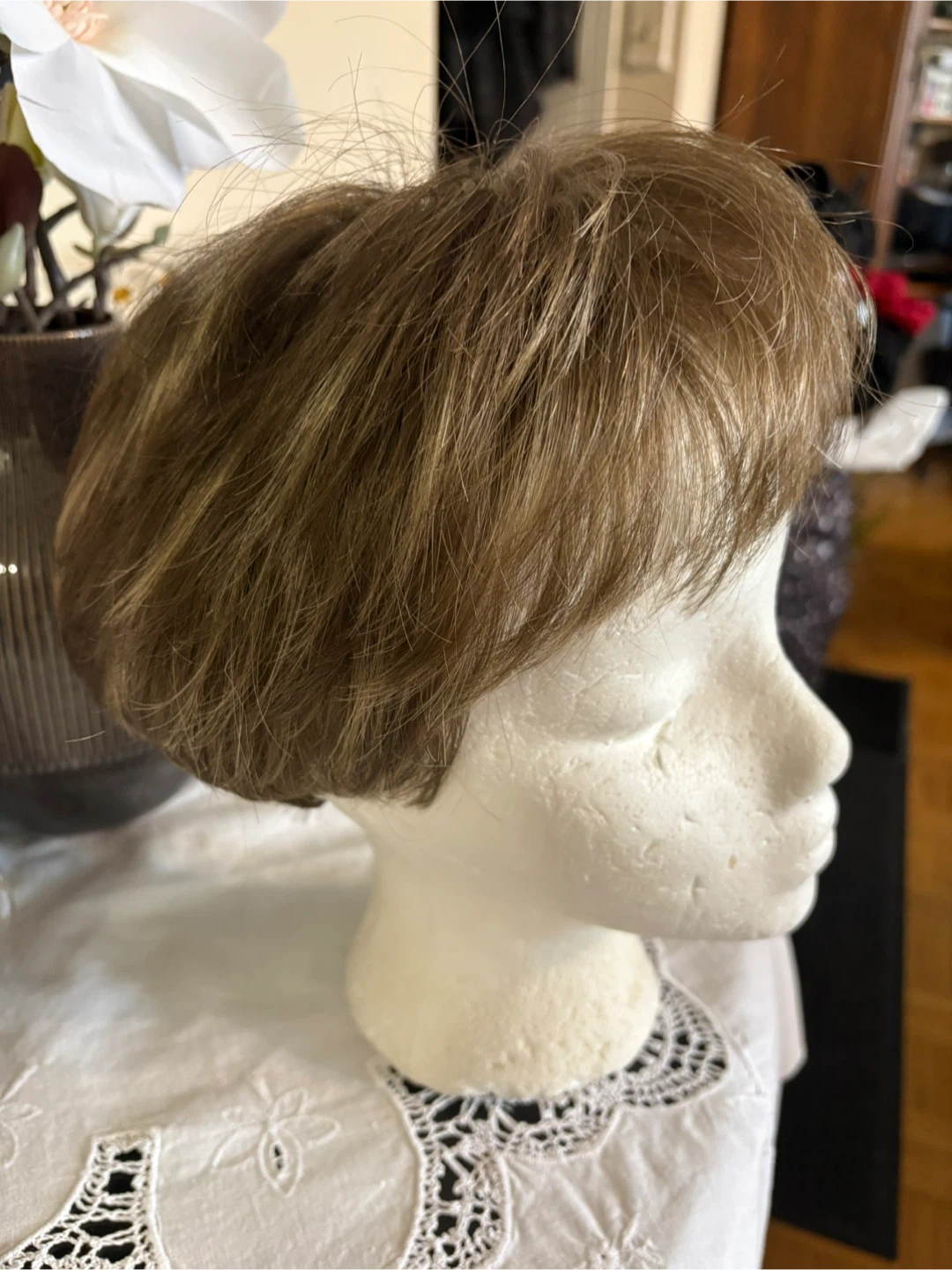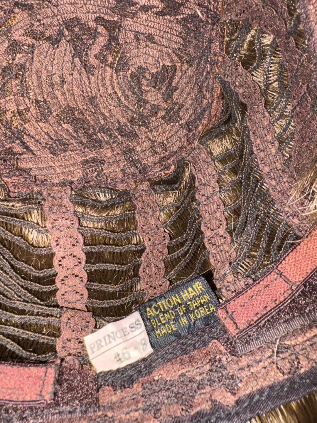 This is a Princess Action short, layered brown wig with subtle highlights. It's in good condition, perfect for a new style or a fun costume!