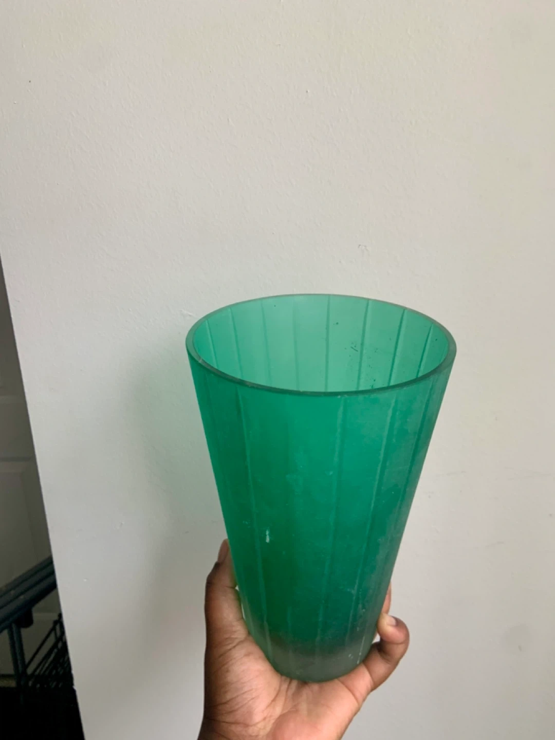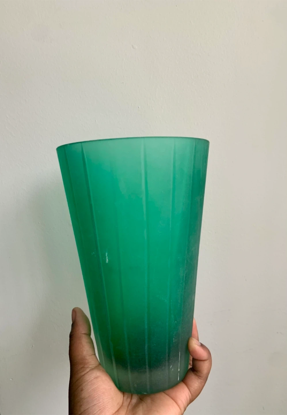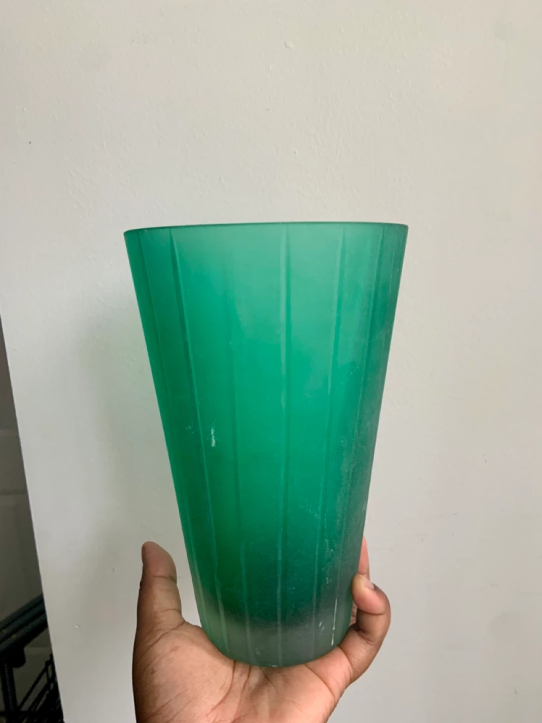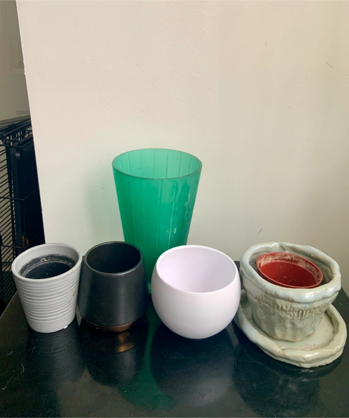 Selling a a collection of five different plant pots and planters. Includes a white ceramic round pot, a grey ribbed cup planter, a black and copper accented pot, a light green textured pot with saucer, and a large green plastic planter. Various materials and styles for your greenery!