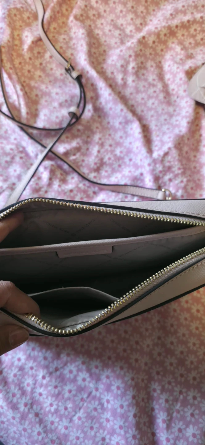 This is a light pink leather crossbody bag from Michael Kors. It has a zip closure and an adjustable strap with chain detailing. The interior features multiple compartments.