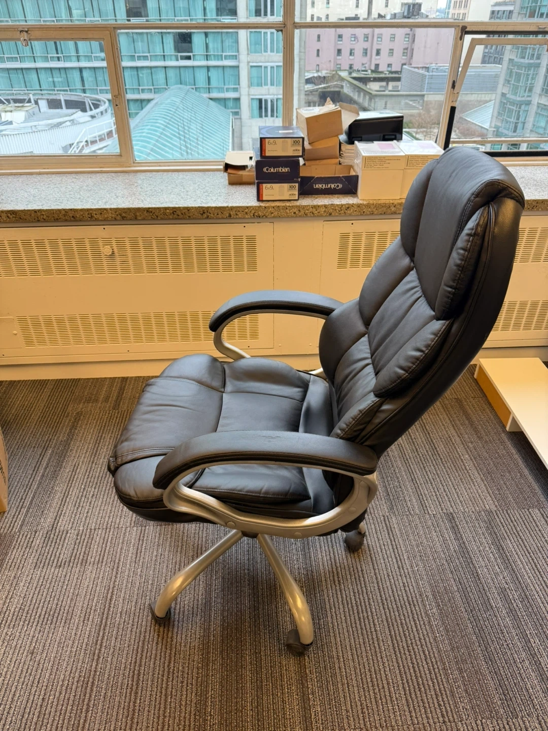 Very Comfortable black PU leather office chair with padded seat and back. It has adjustable height and swivel base with casters for easy mobility. This chair is suitable for home or office use.