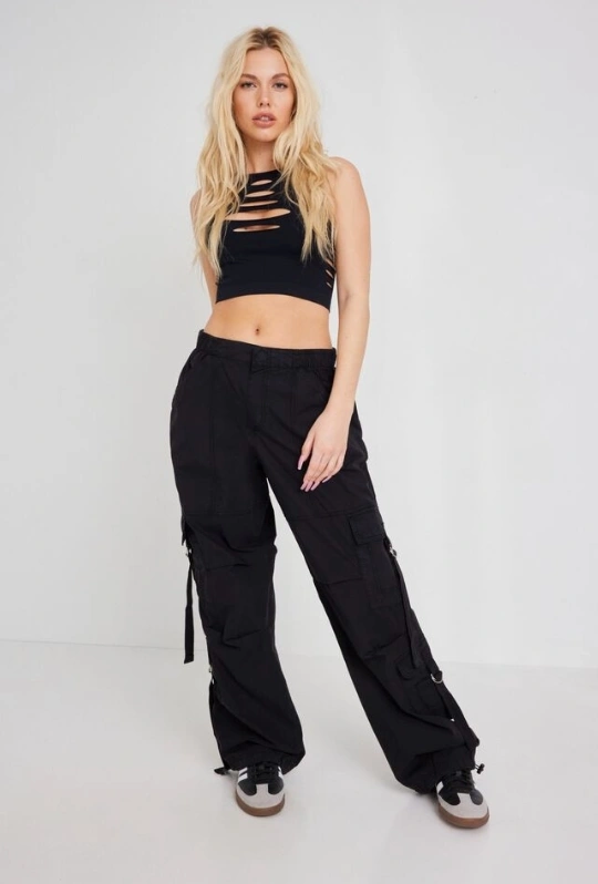 Awesome black Garage cargo pants with strappy pockets. I wear size 12 dress size and they fit great, but changed my mind on the style and missed day to return. Cost was originally 92.00 with tax. Pants are brand new with tags, never worn just tried on. Quality is lovely and waistband is stretchy so these will fit size 10 or 14 as well.