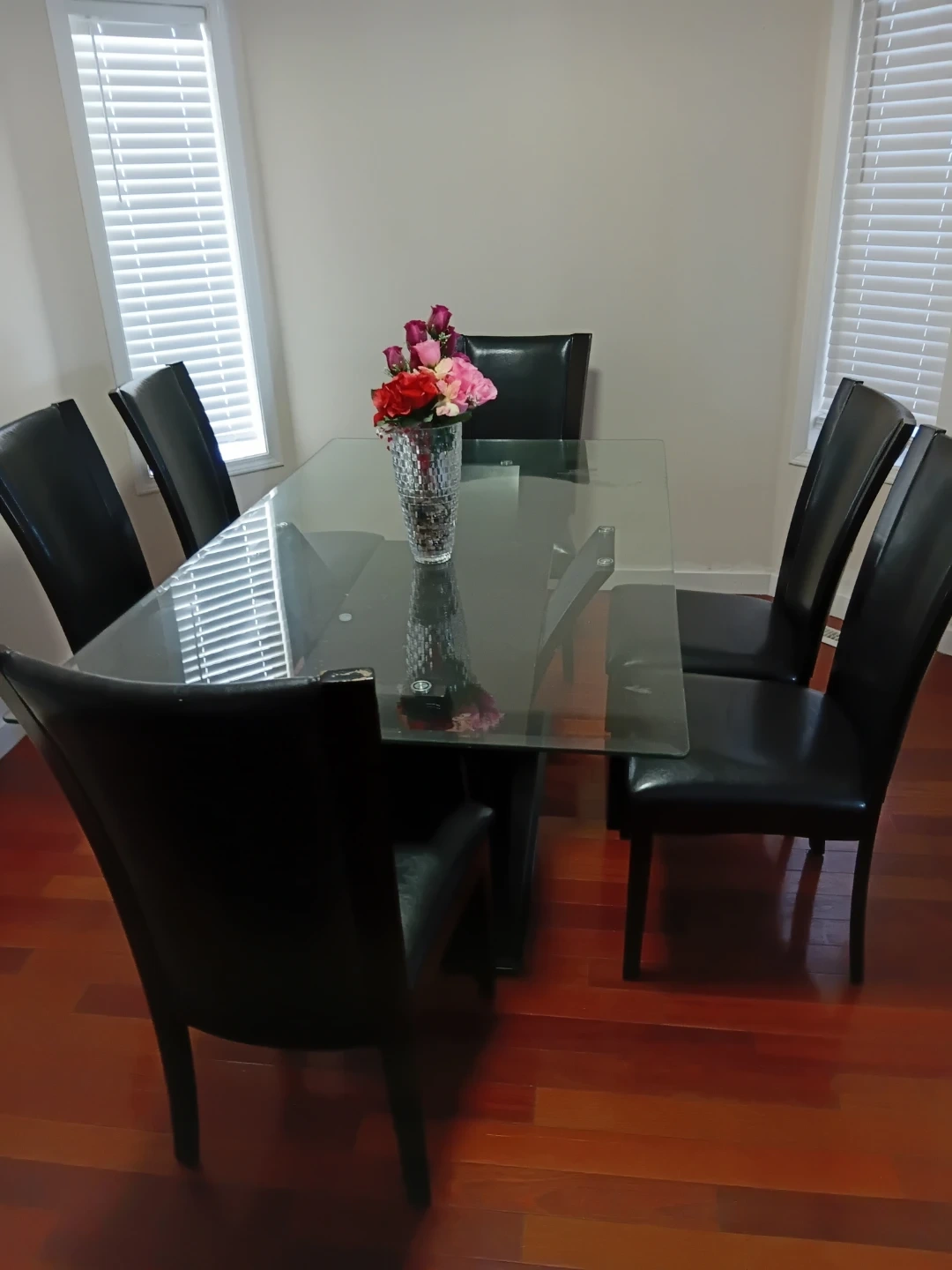 Rectangular glass-top dining table with a modern black base. Comes with six matching black faux-leather chairs. Seats up to six people comfortably.