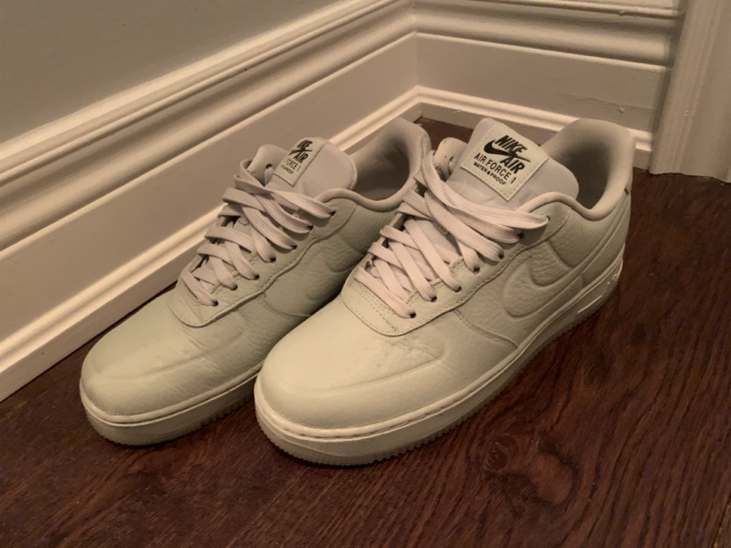 A pair of Nike Air Force 1 sneakers. These kicks are waterproof, making them great for any weather. Leather upper.