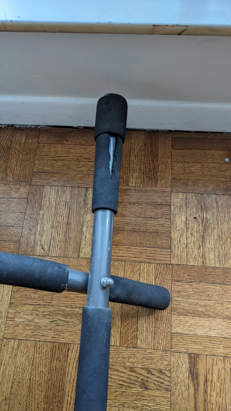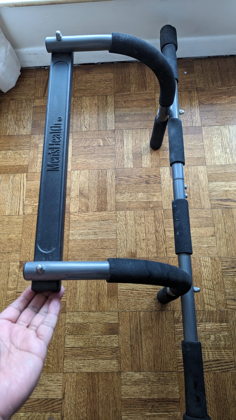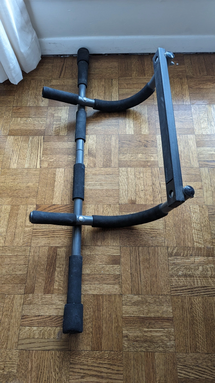 Great solution for a doorway. Giving it away as it doesn't fit in my apartment doorways. There's some slight damage to the cushions but that doesn't affect functionality.