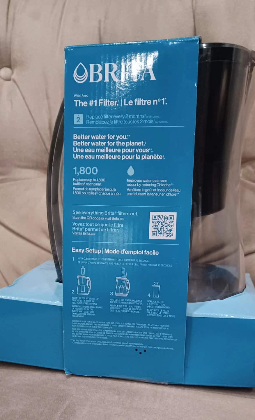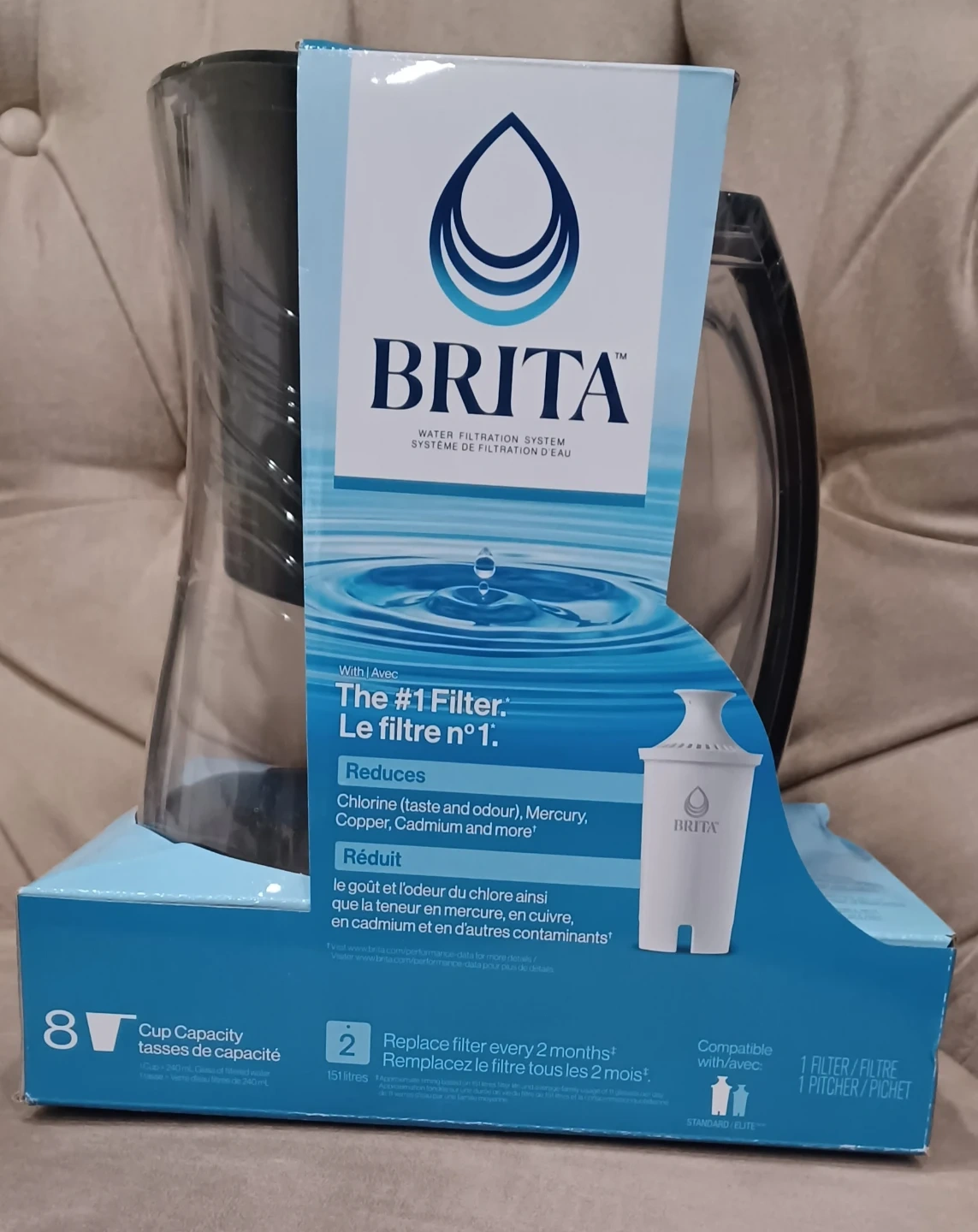 This Brita water pitcher has an 8-cup capacity. It reduces chlorine, taste, and odour. Filter should be replaced every two months.