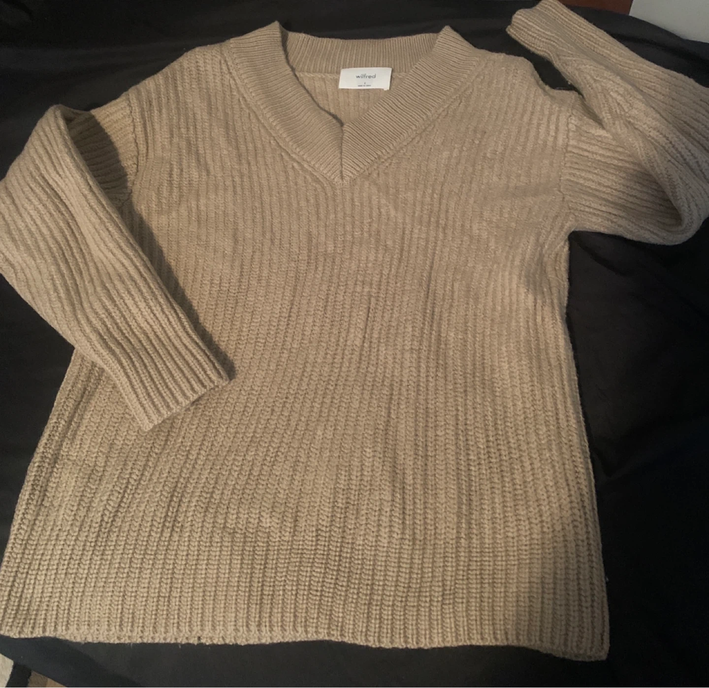Tan Wilfred merino wool sweater will keep you cozy and warm. It's a comfortable and versatile piece for your wardrobe. Size is small.