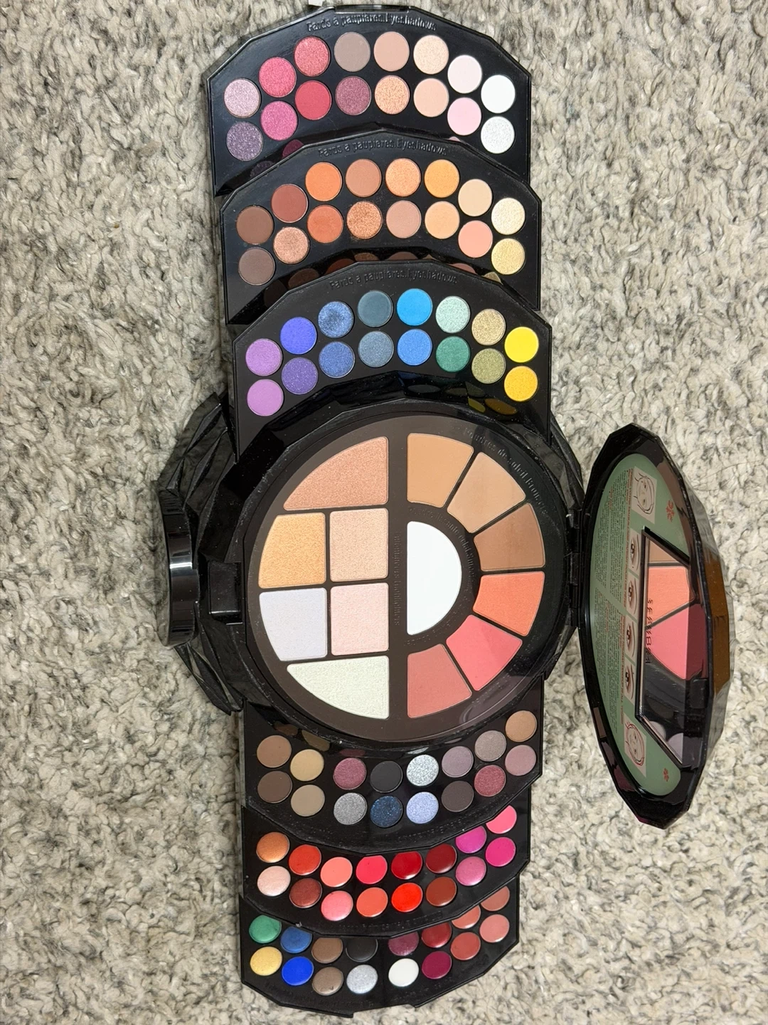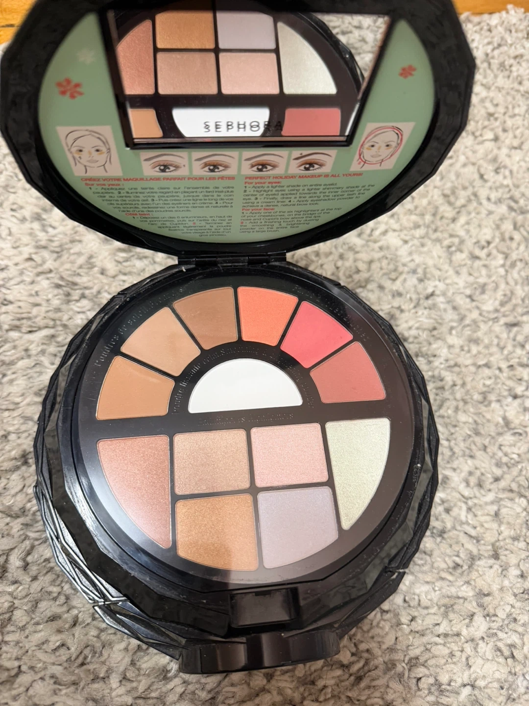 This Sephora makeup palette includes numerous eyeshadows, blushes, and highlighters. It's a comprehensive set for various makeup looks.