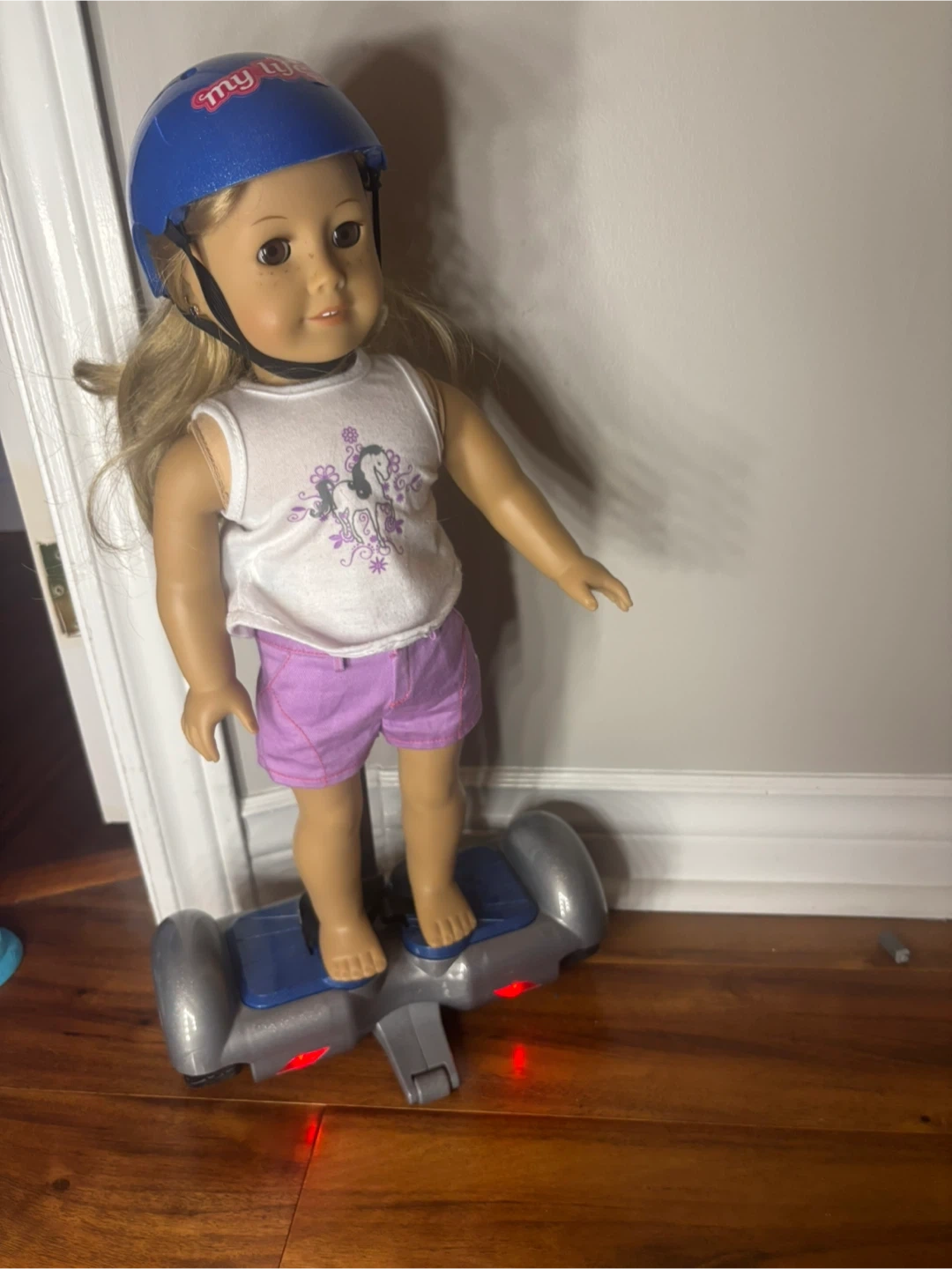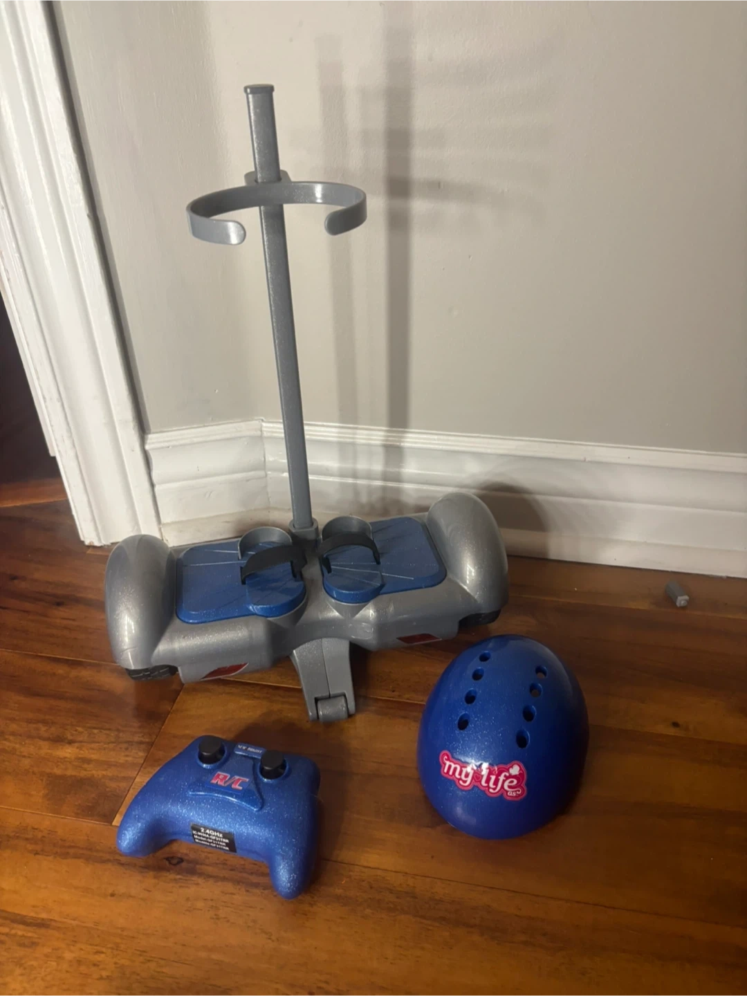 This is a My Life As RC hoverboard set for dolls. It includes the hoverboard, a blue helmet with "my life" logo, and a remote control. suitable for 18” dolls ( Doll NOT included)