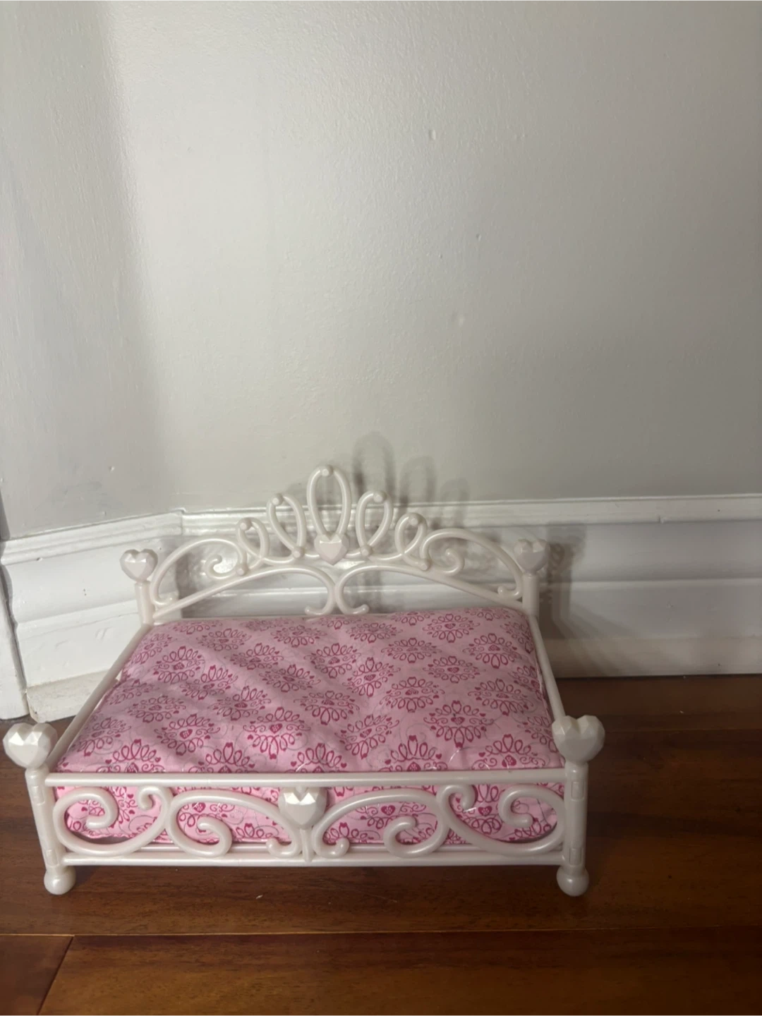 White doll dog bed with a pink patterned mattress. It's designed with heart details and a decorative headboard. This bed is perfect for small dolls or stuffed animals! ( Dog NOT included )