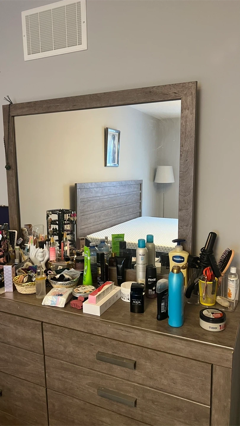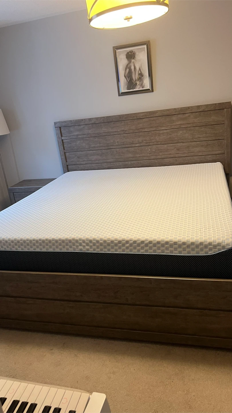King size bed with mattress and wooden dresser features a large, rustic-style mirror. It has six drawers for storage and a distressed wood finish. The top surface is ample for displaying decor or holding personal items.with 2 nights stands