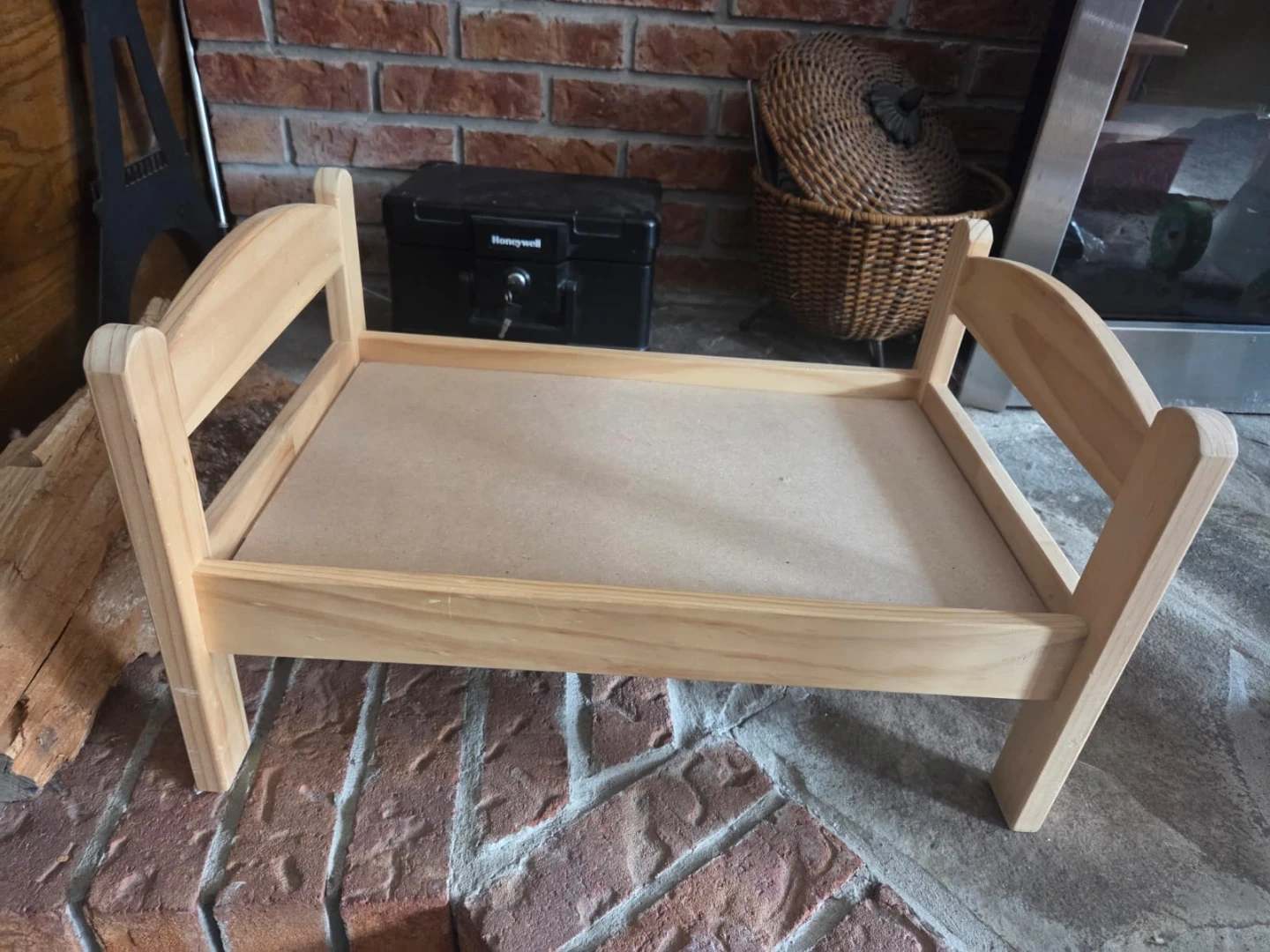 A charming wooden doll bed, perfect for imaginative play. It's made of solid pine wood with a smooth, unfinished surface, ready for customization. This bed is a sweet addition to any play space!