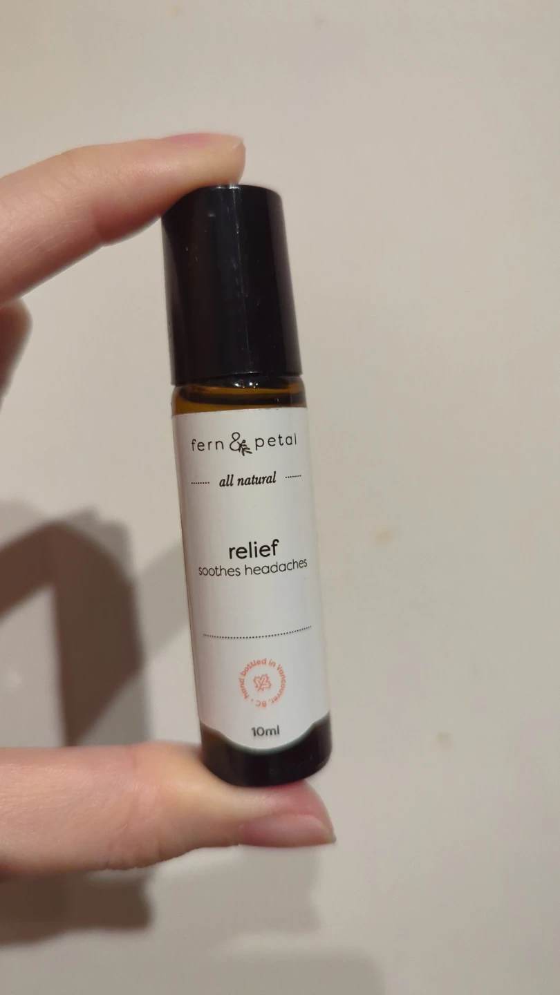 Fern & Petal all natural relief rollerball. It soothes headaches. Contains peppermint, eucalyptus, lavender, rosemary, vetiver, coconut oil, and Vitamin E. 10ml bottle.