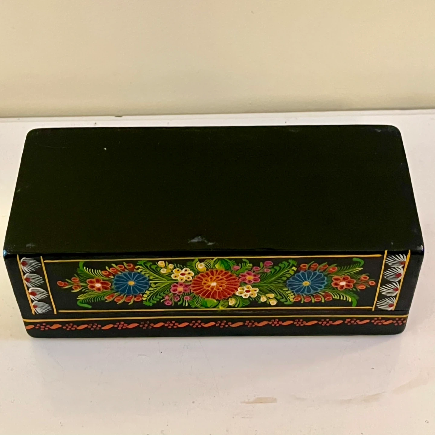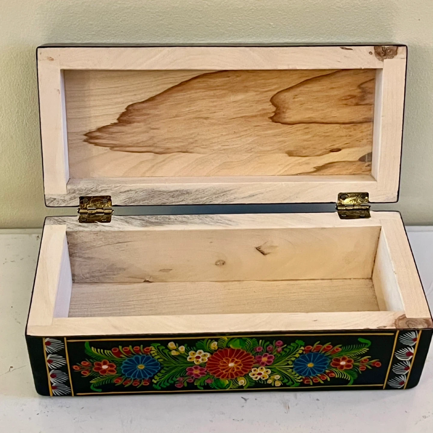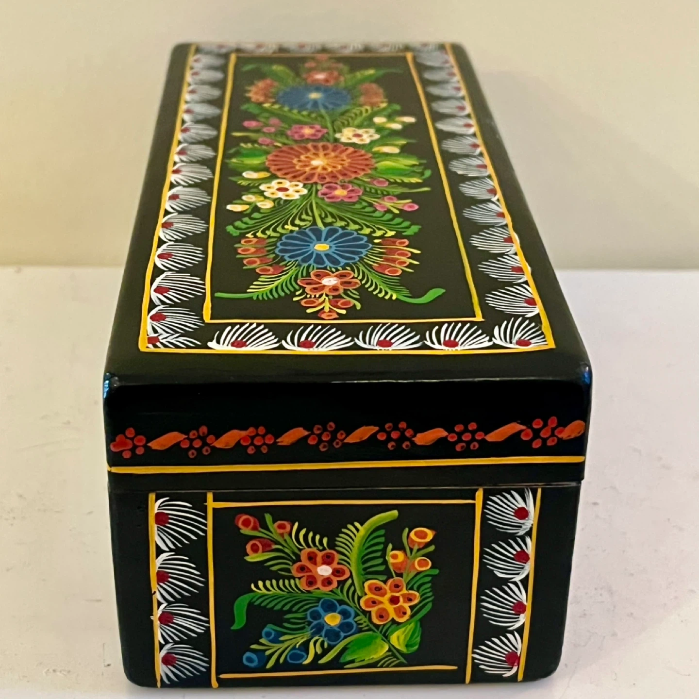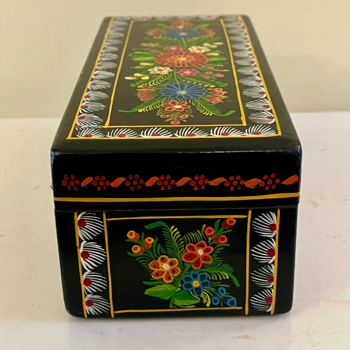 Hand-painted Mexican Olinalá lacquer box made from fragrant linaloe wood. These boxes are a renowned form of folk art from the town of Olinalá in Guerrero, Mexico, which is a major center for laquerware production.