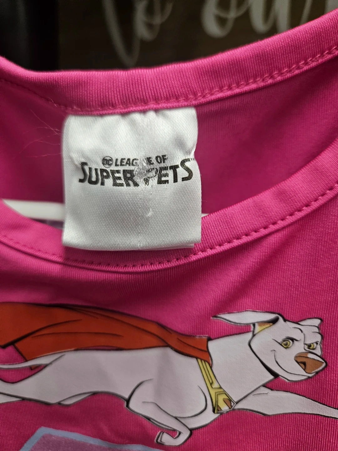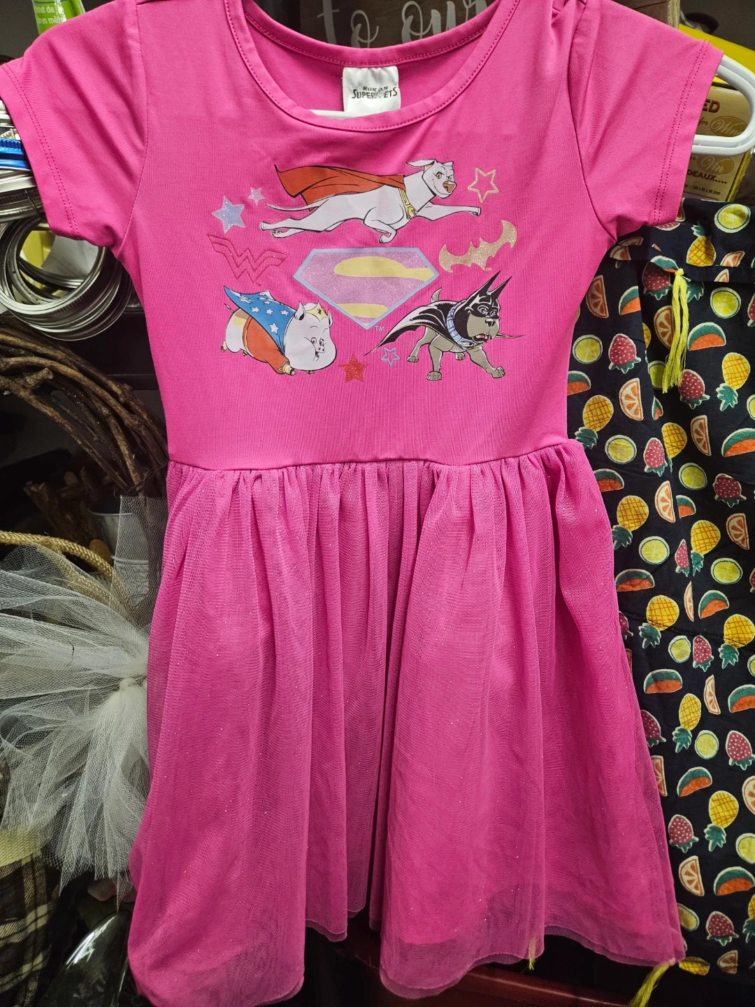 This pink dress features characters from DC League of Super-Pets! It's made with a polyester and spandex blend for comfort. The skirt has a sparkly overlay. This dress is size 4.