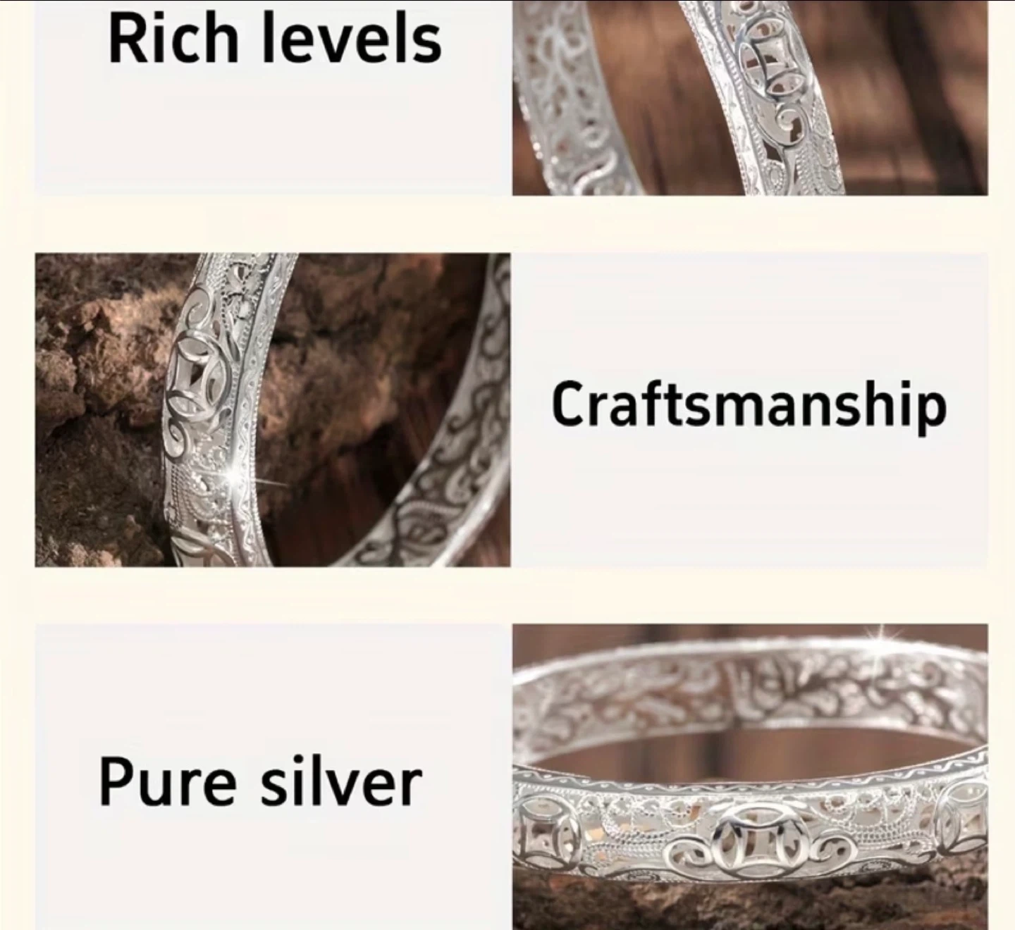 This is a beautiful S999 silver bangle bracelet. It features intricate filigree designs .The bracelet has a diameter of 6cm and a weight of 29g. It's made of pure silver.