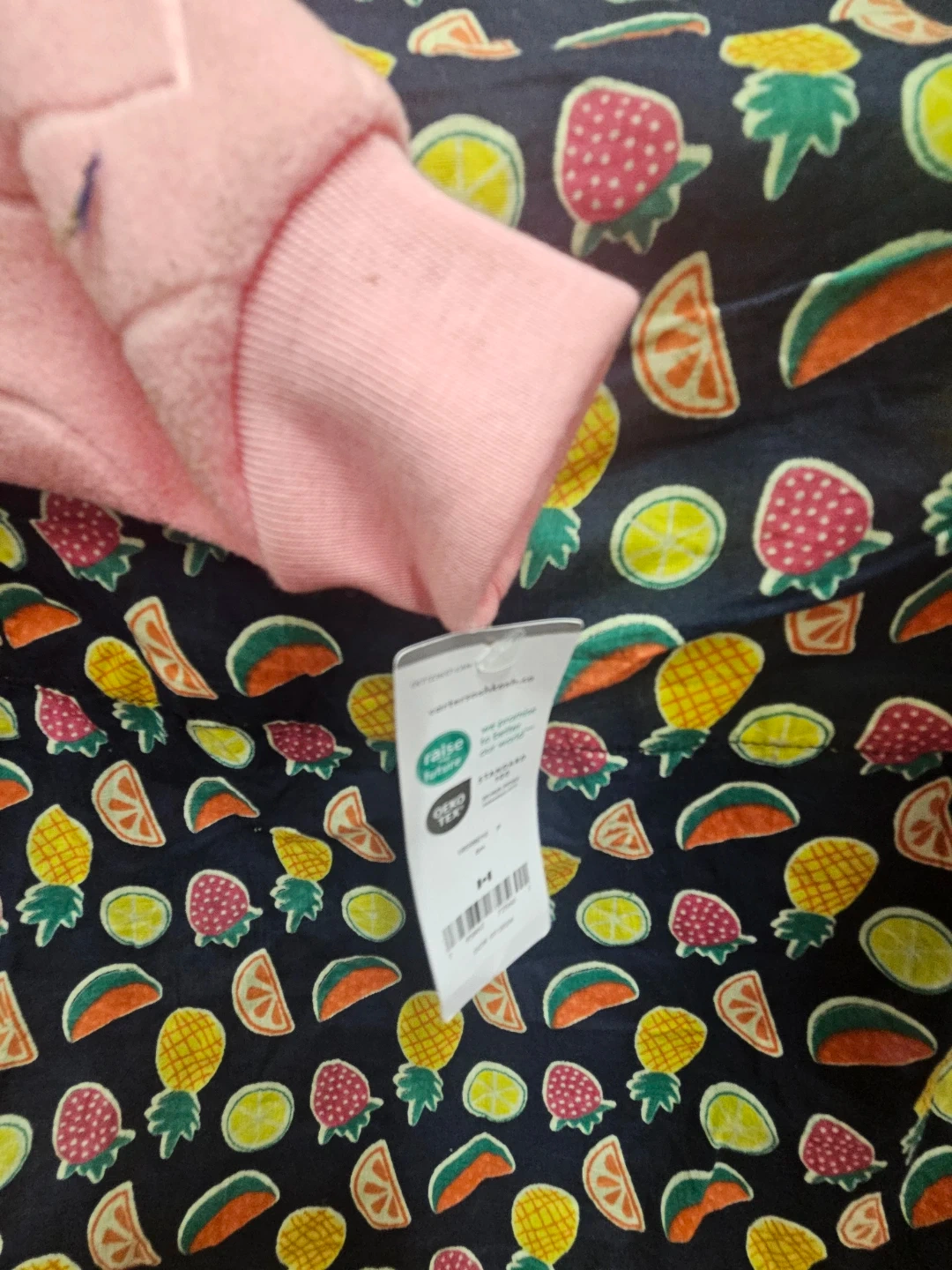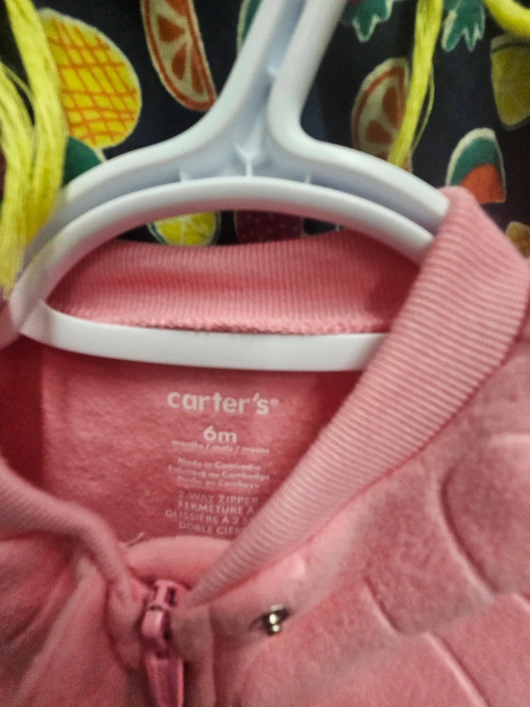This adorable pink Carter's fleece sleeper features a cute embossed heart pattern. It's a 2-way zipper front for easy changes. Made for babies 6 months.