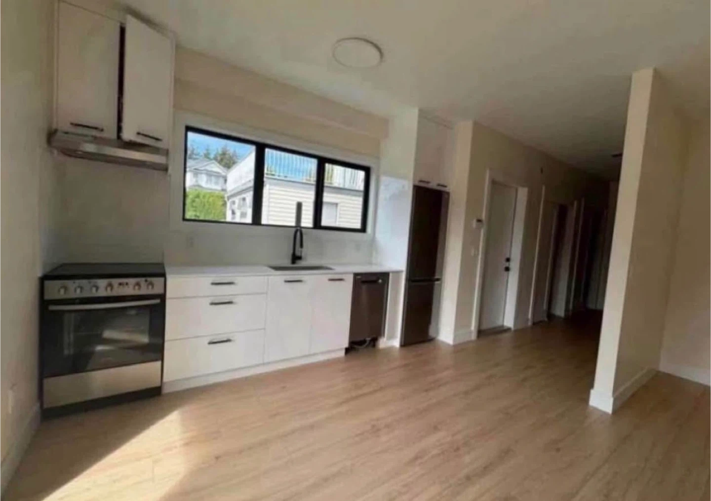 Newly renovated kitchen with white cabinetry, stainless steel appliances, and quartz countertops. The bathroom features a walk-in shower and modern fixtures. Spacious living areas with laminate flooring throughout. Ample natural light from large windows and patio doors.