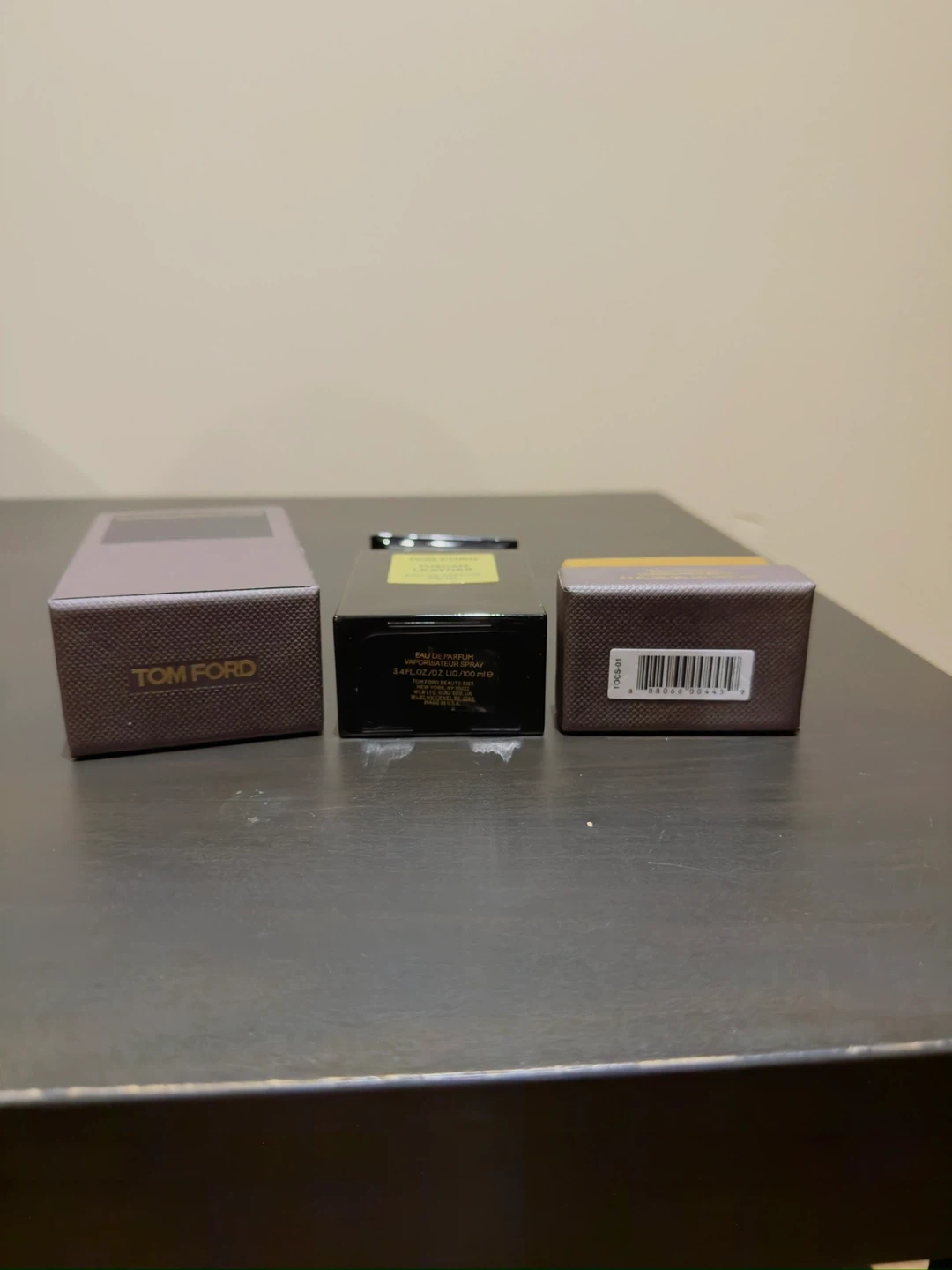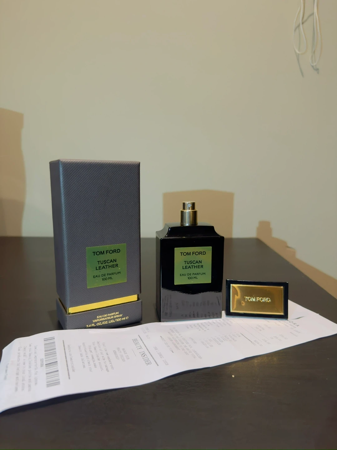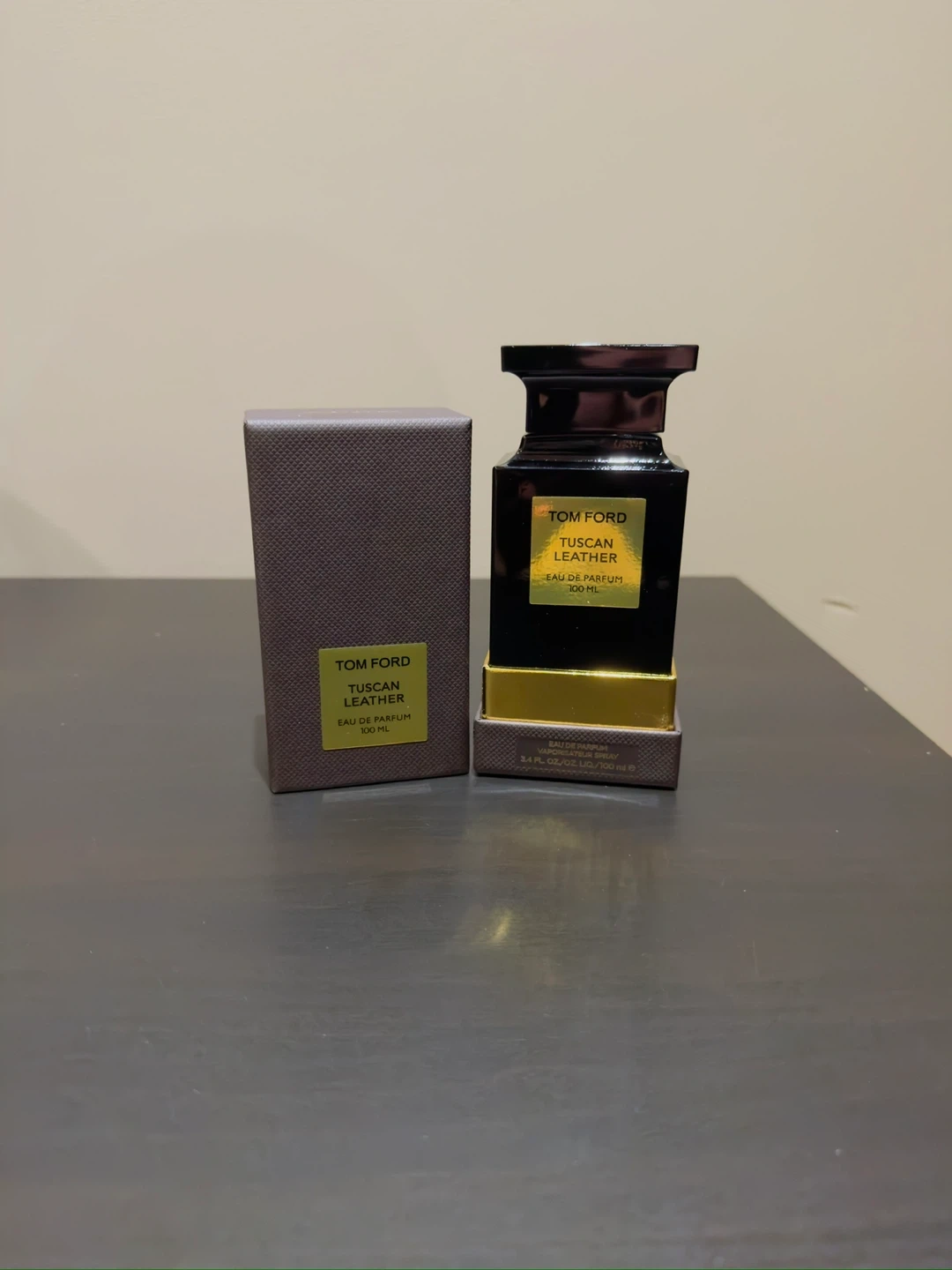 This is a Tom Ford Tuscan Leather Eau de Parfum. It comes in a 100 mL bottle. The original box is included.