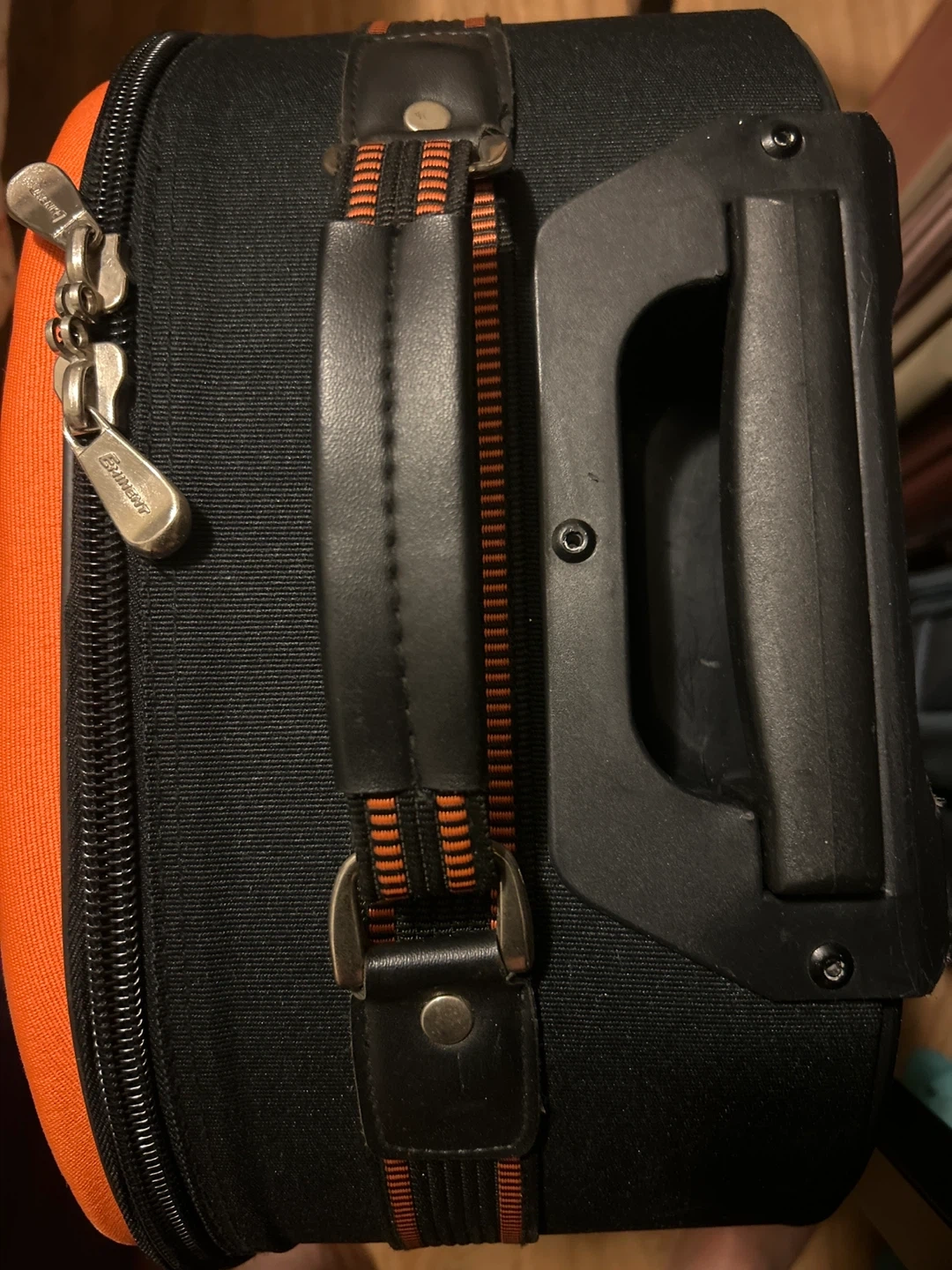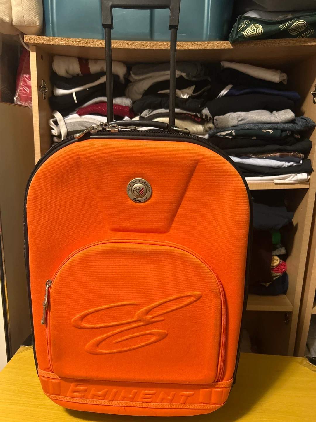 This is an orange Eminent rolling carry-on suitcase. It's made with a soft fabric exterior and features a front zippered pocket. The telescopic handle and wheels make it easy to transport your belongings on trips.