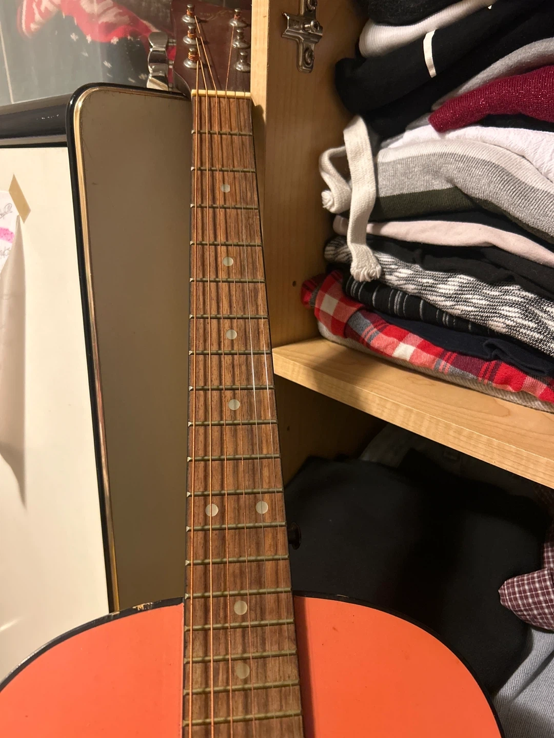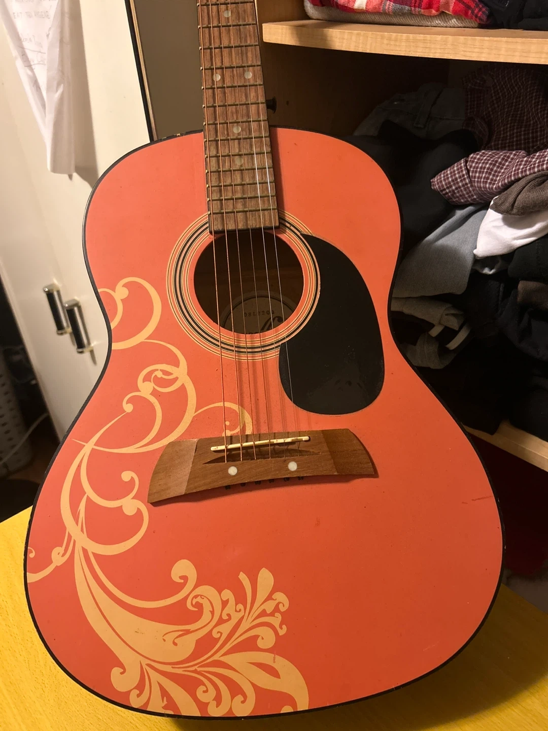 Acoustic guitar in a vibrant orange colour. It features a decorative swirl pattern on the body. Great for beginners or as a decorative piece!