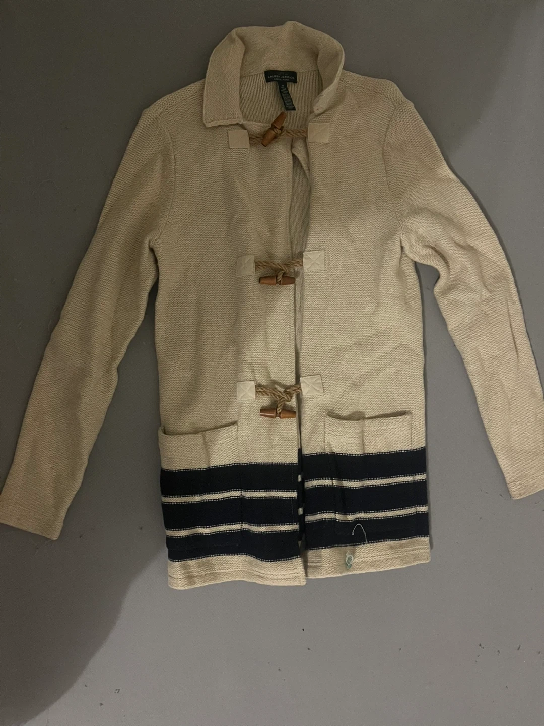 A Ralph Lauren cardigan with toggle closure and navy stripes. Made of 100% cotton. Size XS.