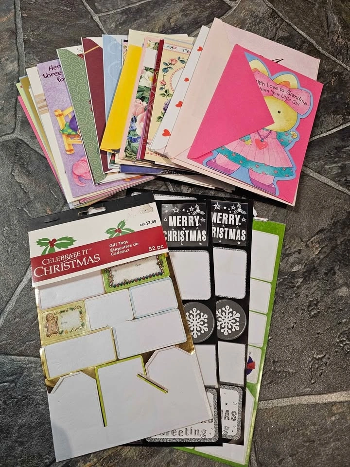 Includes a variety of greeting cards for occasions like Valentine's Day, Christmas, and birthdays, plus miscellaneous cards. Also contains unused bows with backing still attached and assorted ribbons.