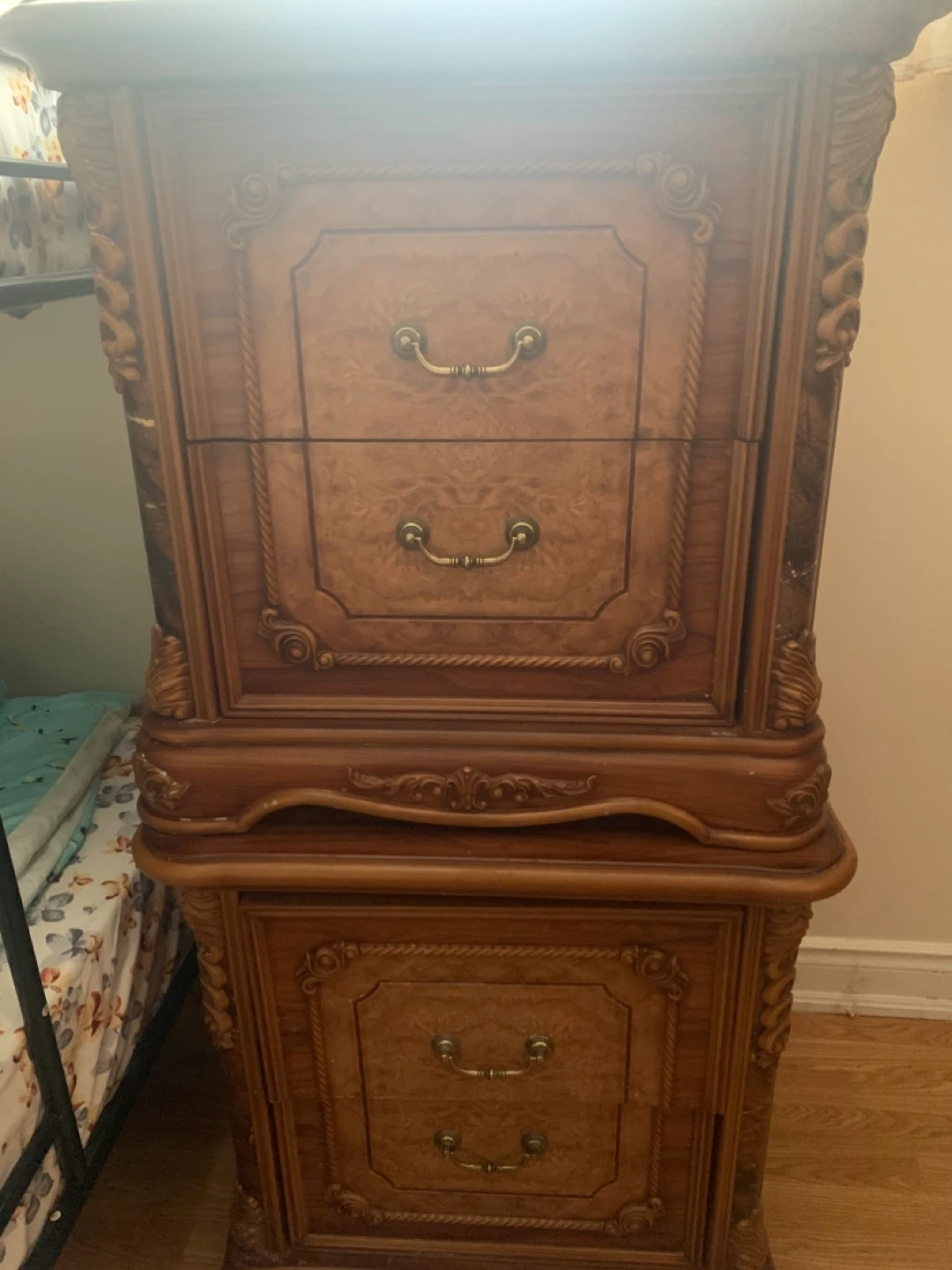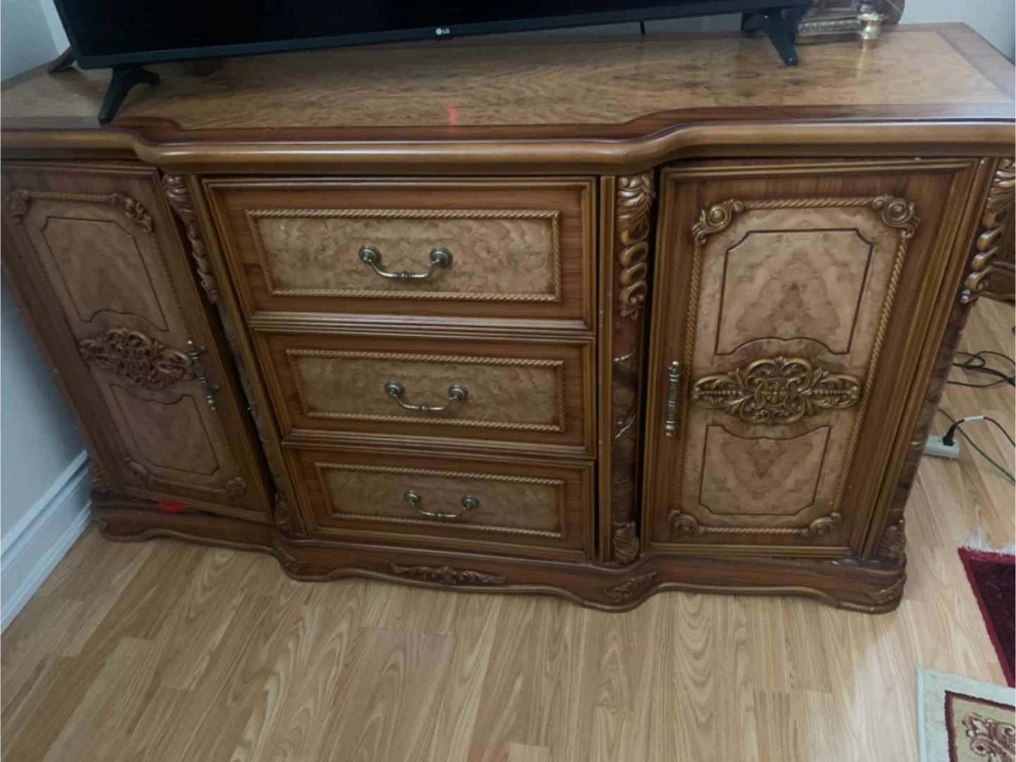 This dresser features a beautiful wood grain finish with decorative carvings and antique brass handles. It has multiple drawers for storage. This piece adds a classic touch to any bedroom just the big drawer is not closeing properly