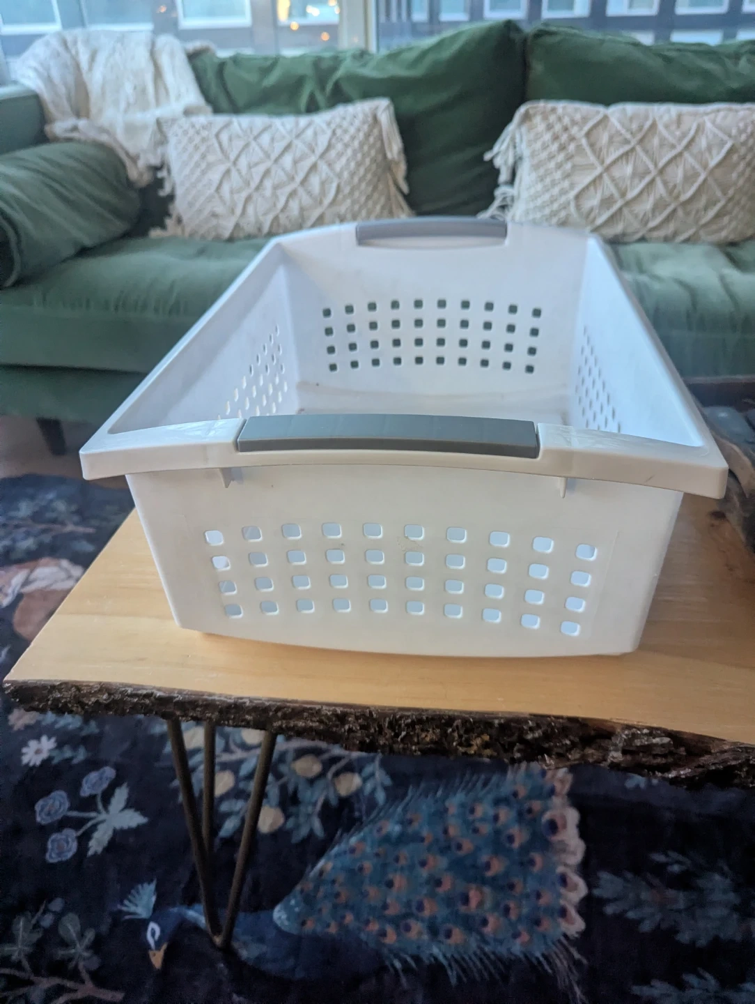 This is a white basket with grey handles. It's made of plastic and features a perforated design.