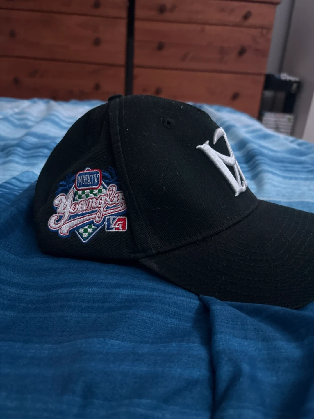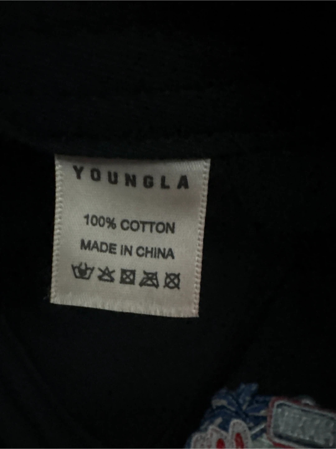 A black baseball cap by YOUNGLA. It's made of 100% cotton and was made in China. This cap features embroidered logos on the front and side.