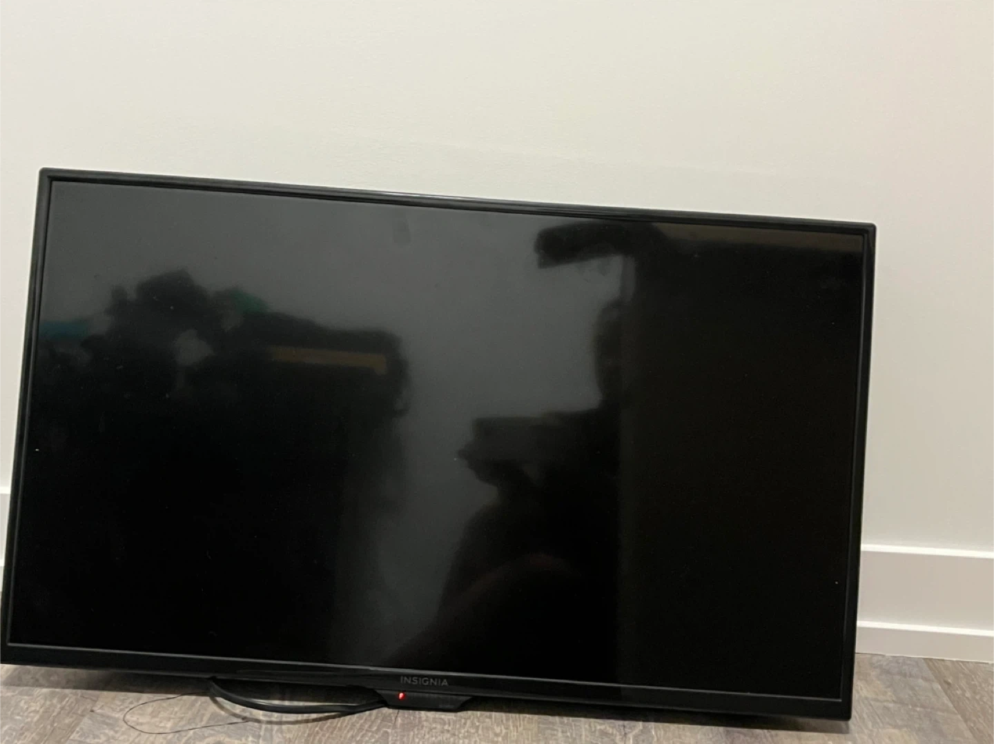 This is an Insignia black flat-screen TV. It's a reliable television for your viewing needs. It's suitable for a bedroom or secondary viewing area.