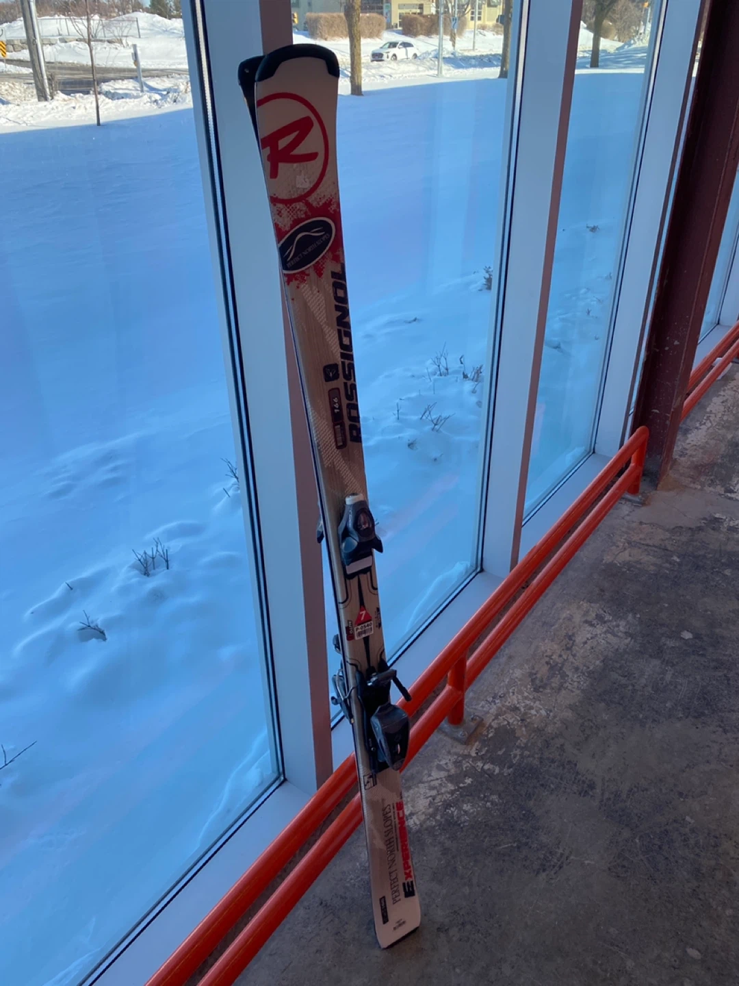 These Rossignol skis are 165cm long with an R15 turn radius. They're handmade in Spain. Skis come with bindings attached.