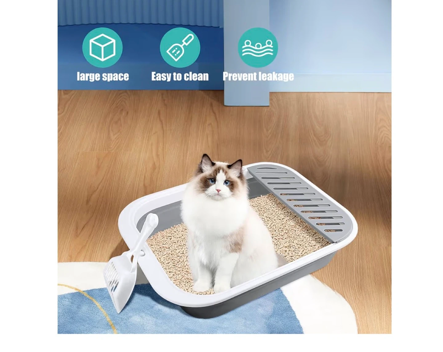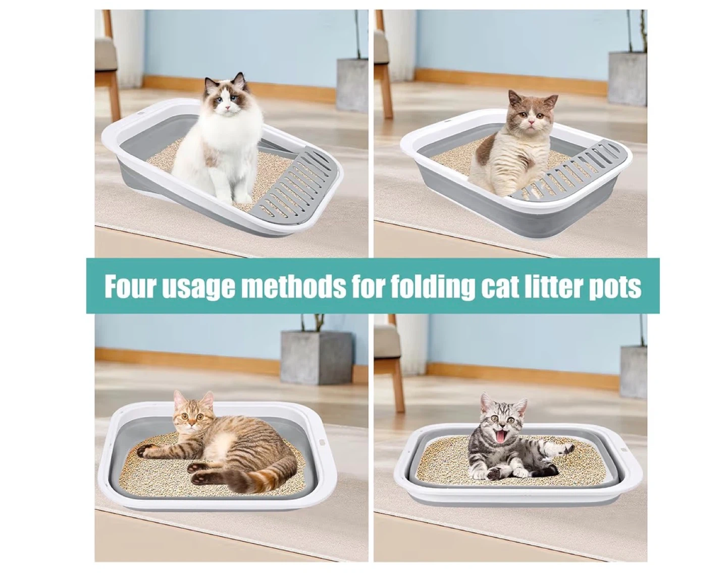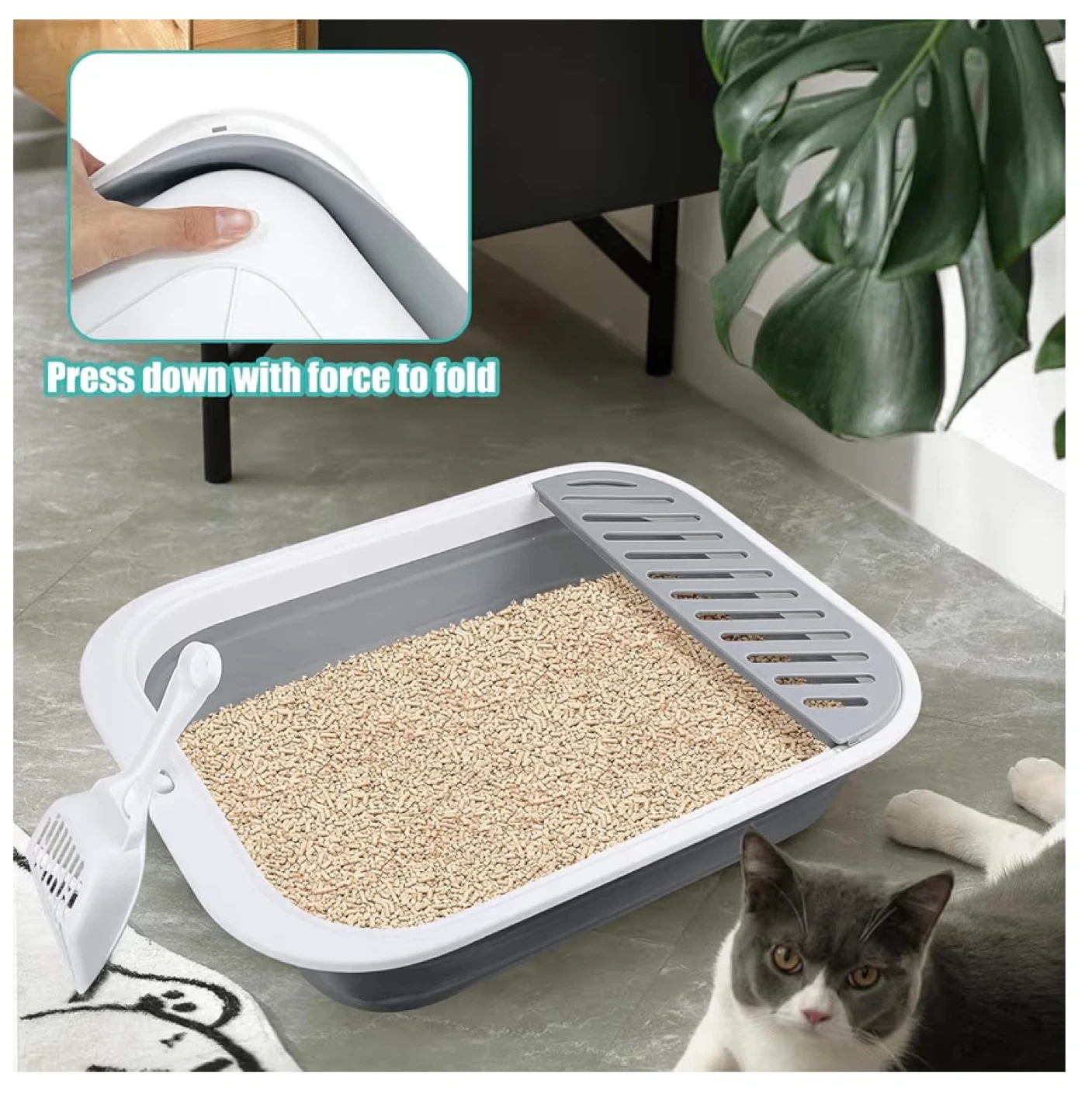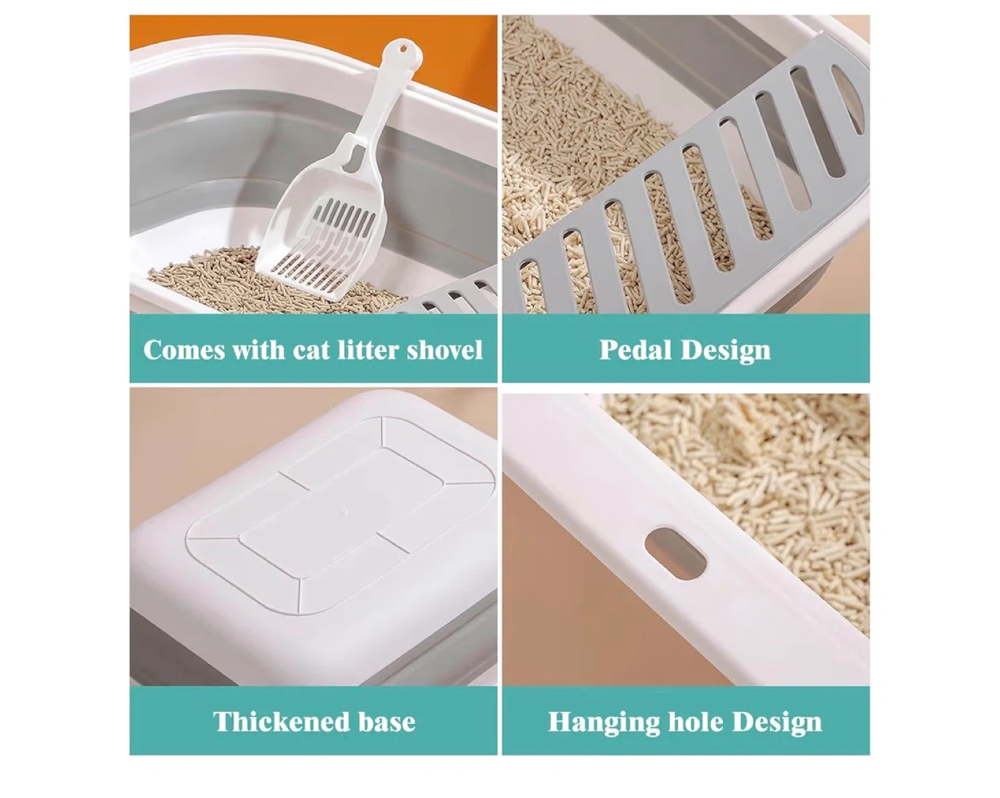 This portable cat litter box features a collapsible design for easy storage. It's made of durable plastic and includes a matching litter scoop. The large space makes it comfortable for cats. A pedal design helps prevent litter scatter.