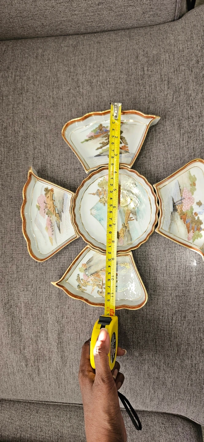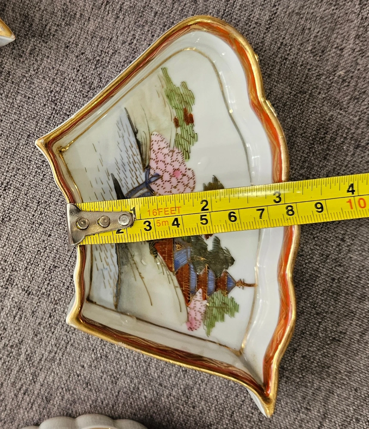 Set of five Japanese vintage intricate, hand-painted enamel designs porcelain dishes featuring intricate Japanese landscape scenes. Each dish has a scalloped edge with gold trim and a unique scenic painting. Great for display or serving small appetizers!