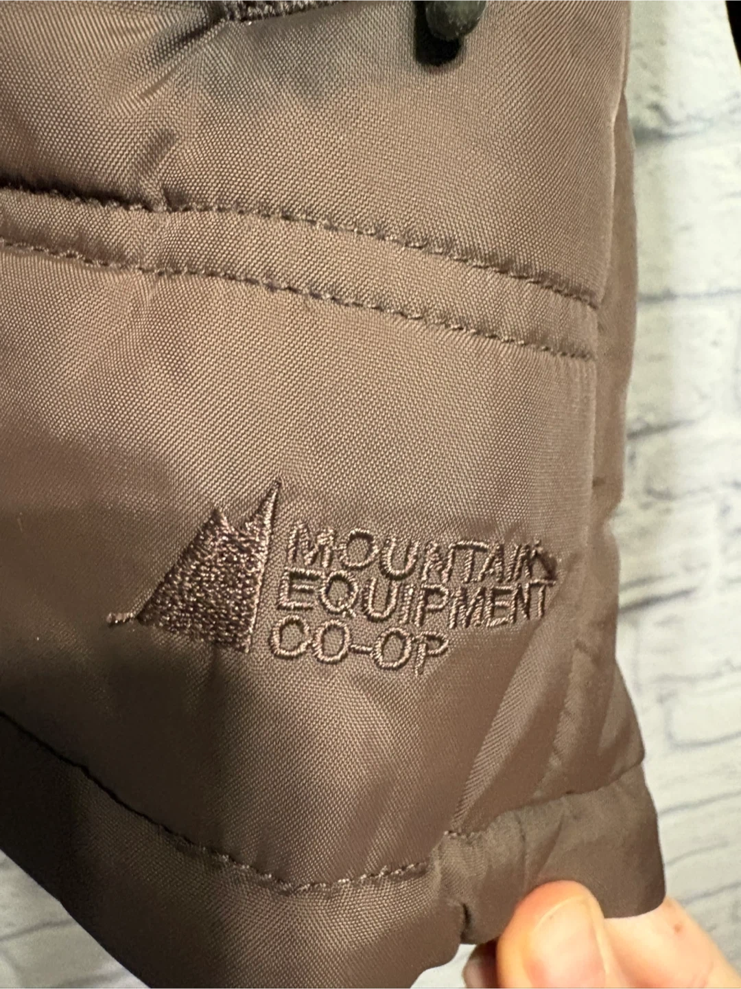 Warm brown puffer jacket from Mountain Equipment Co-op. Shell is 100% Nylon with Polyurethane Coating, and the fill is 100% Polyester. It has a full zip front and a cozy hood. Perfect for staying warm on chilly days! Pick up only.