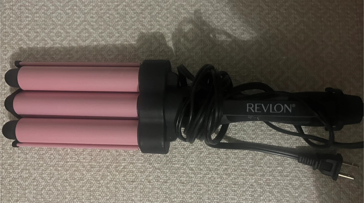 This is a pink Revlon 3-barrel hair waver. It's a simple tool for creating beachy waves. It has a swivel cord for easy styling.