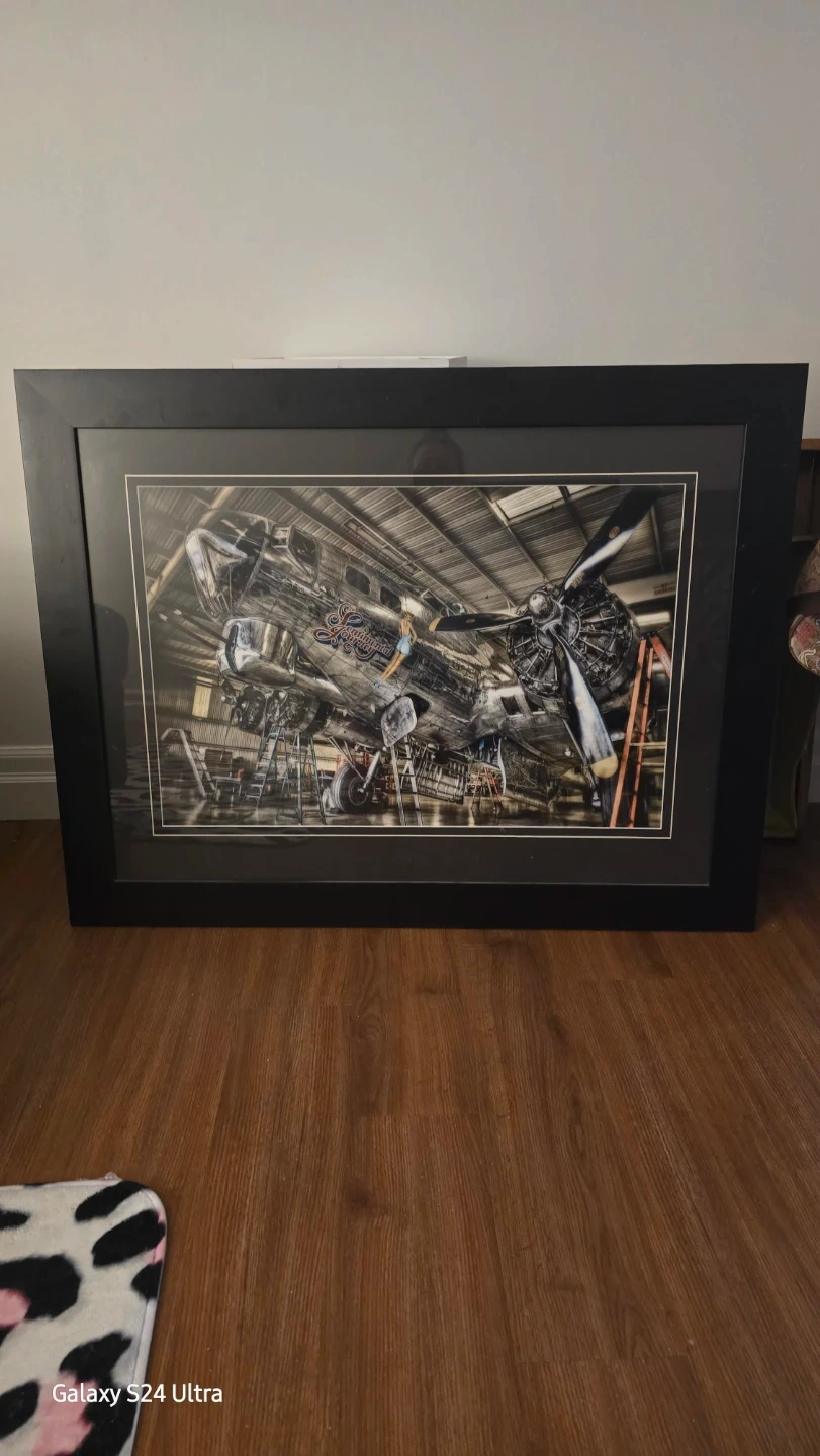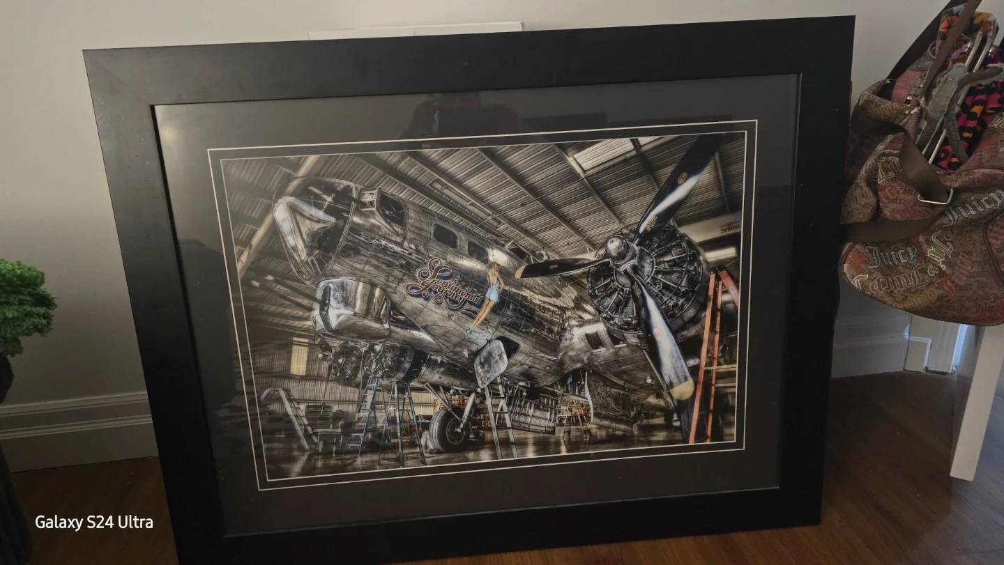 Framed print featuring the "Continental Nurse" B-17 bomber aircraft in a hangar setting. Black wood frame. Sexy lady in middleAdds a unique touch to any space!