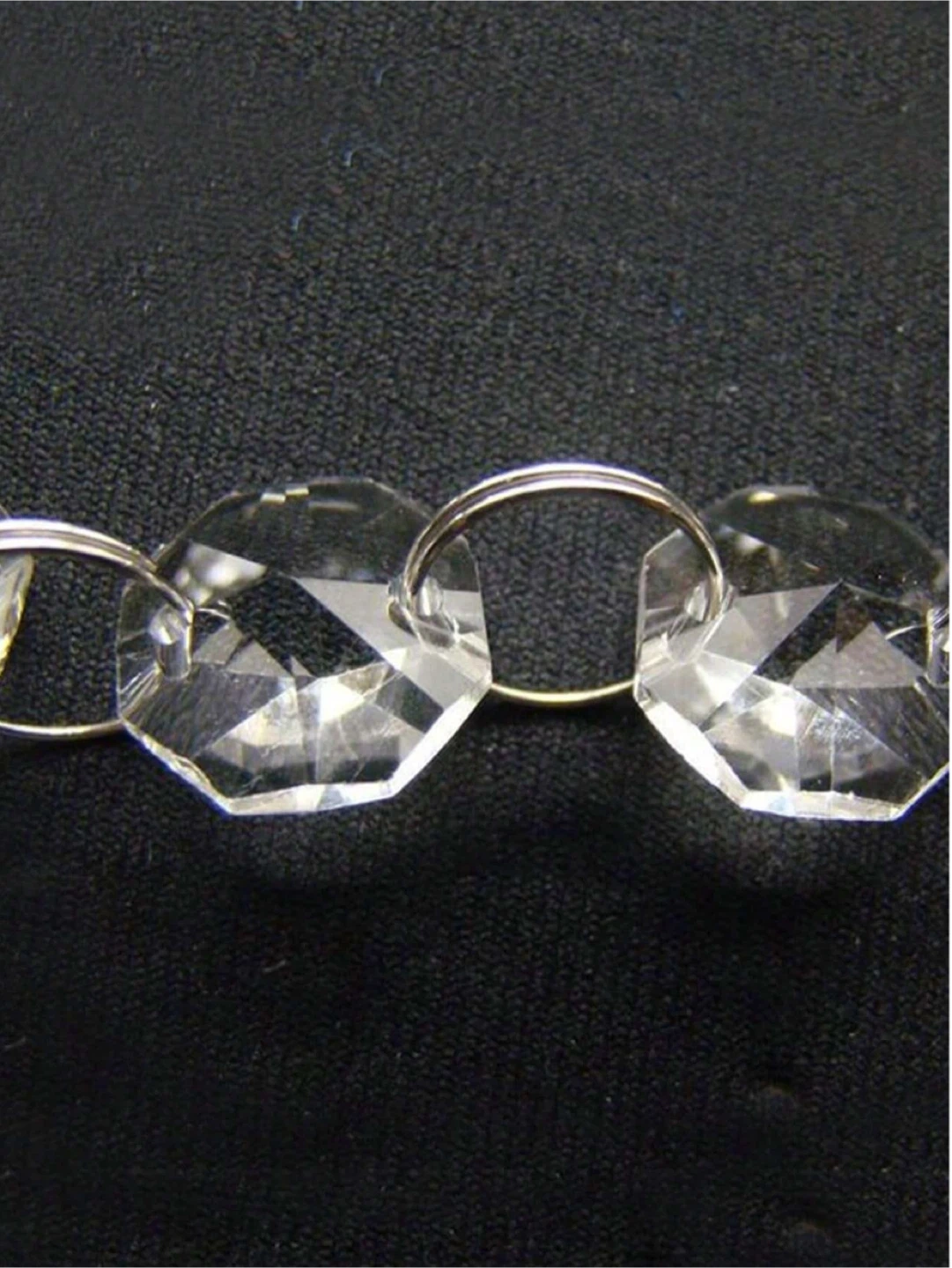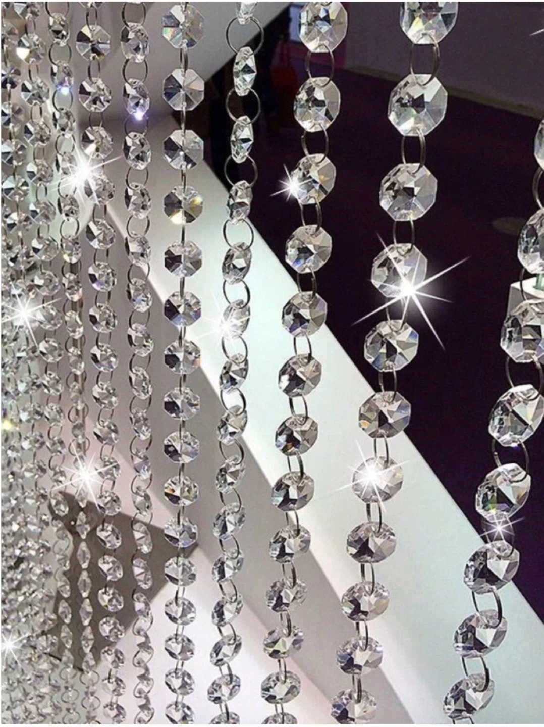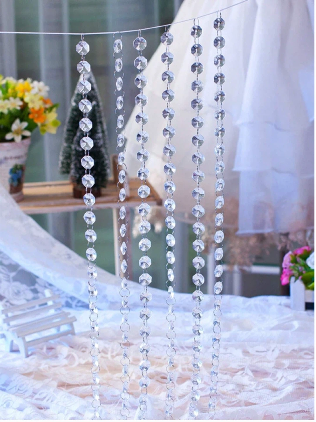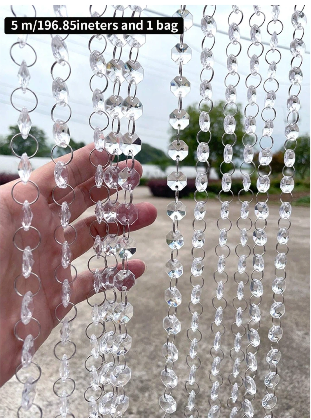 These crystal bead strands are 5 meters long. They're made of clear acrylic beads with silver-toned connectors. Strands are great for DIY decor or adding sparkle to events!