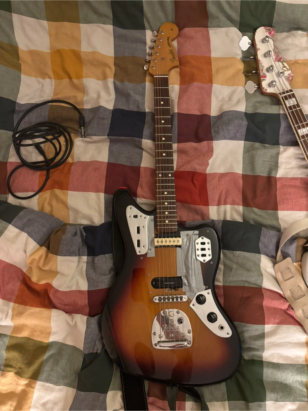 This is a Fender Jaguar electric guitar with a sunburst finish. It's a classic model, and it's ready for a new home. Includes a guitar cable.