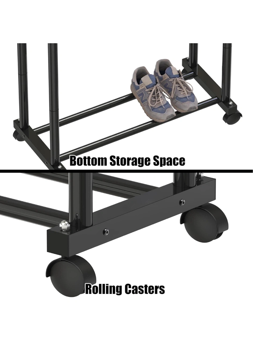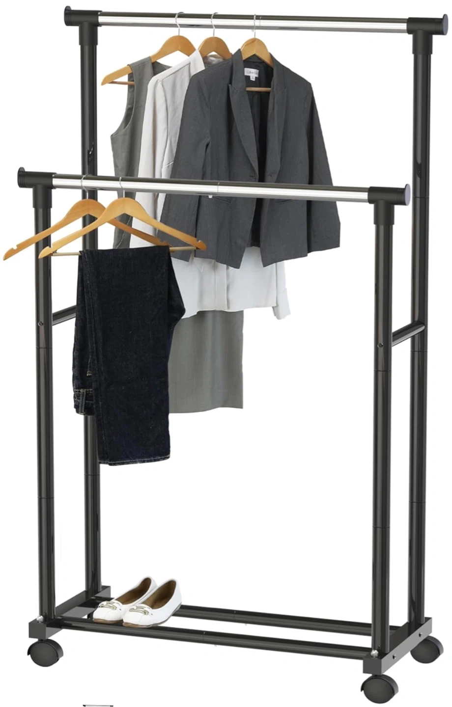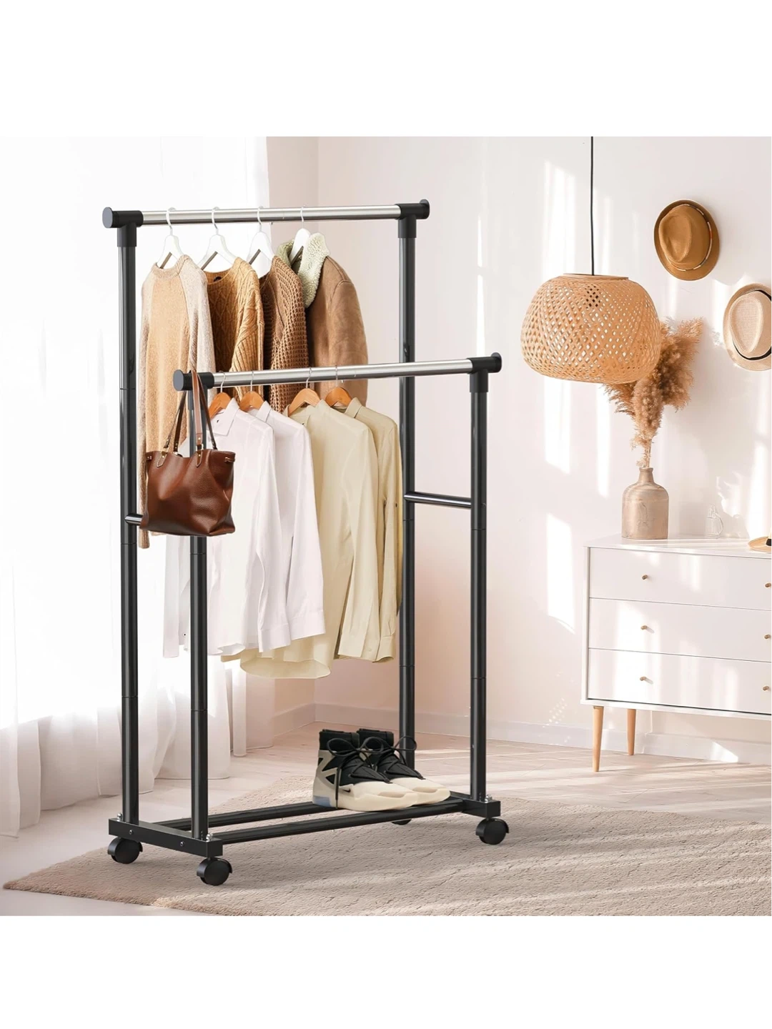 This double garment rack offers sample hanging space for clothes. It features a bottom storage shelf for shoes or accessories. The rolling casters make it easy to move around your space!