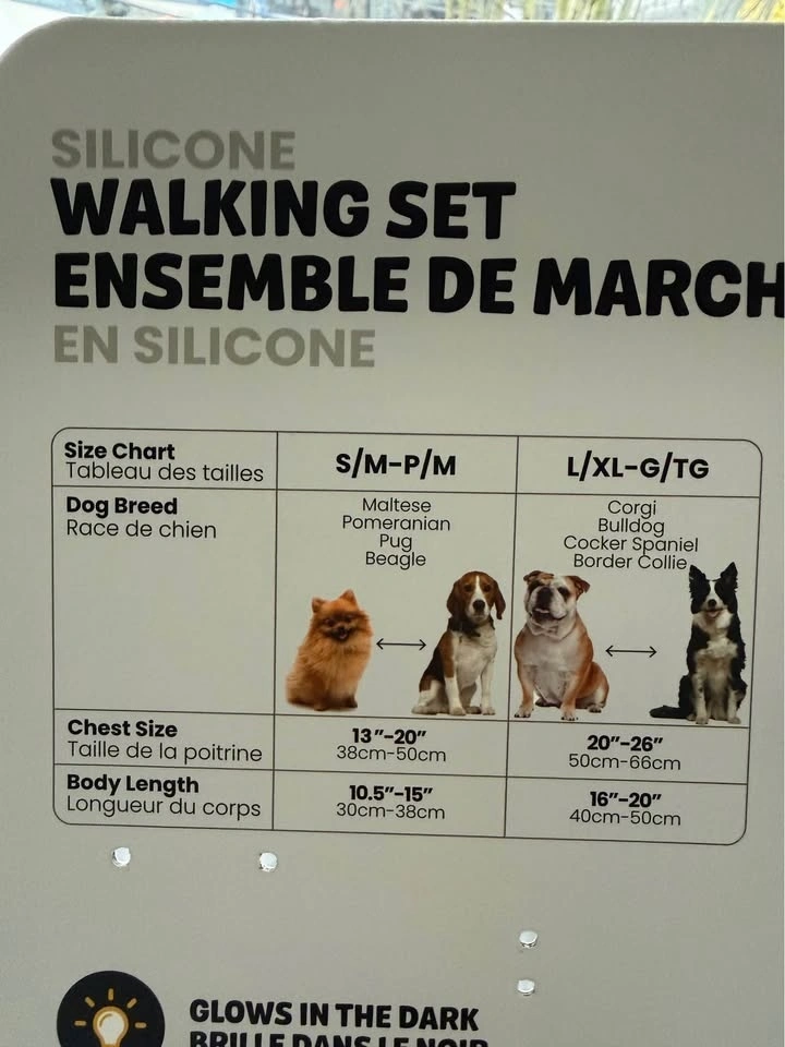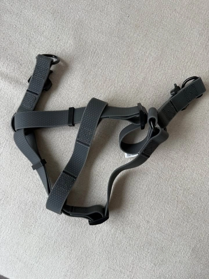 Black dog harness and leash set. Glows in the dark, water resistant, has a textured pattern, and metal closure. Feel free to message if you have any questions!