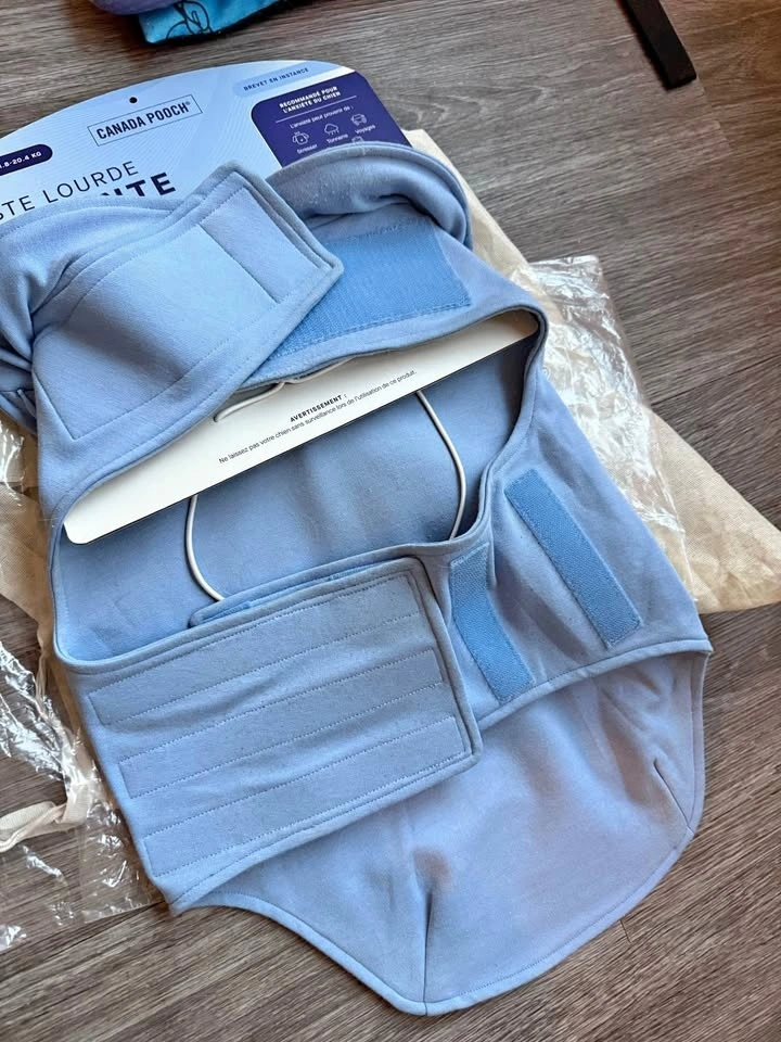 Blue Canada Pooch Weighted Calming Vest, size L. For dogs 26-45 lbs. Has a WEIGHTED CALM insert with non-toxic microbeads. Provides gentle pressure to help calm anxious dogs. Machine washable. Adjustable fit with velcro closure for a snug fit.