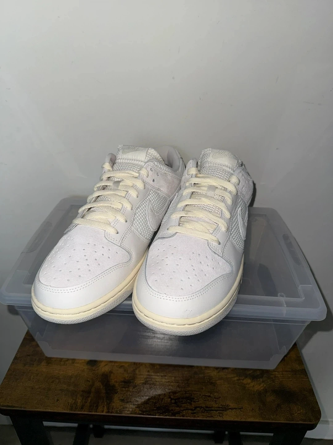 Nike Dunk Low sneakers in a white and cream colourway. These kicks feature a classic silhouette with perforated toe boxes and suede overlays. They're comfy and stylish for everyday wear!
