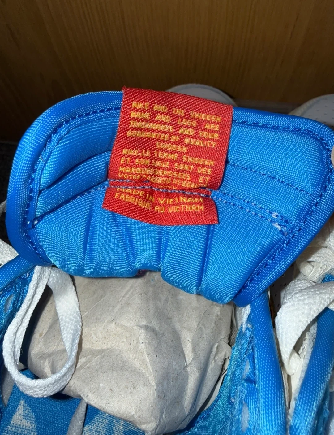 White leather Nike Dunk Low sneakers with blue lining and accents. Features red and yellow swoosh details and Nike branding on the heel. These are a stylish pair for everyday wear.
