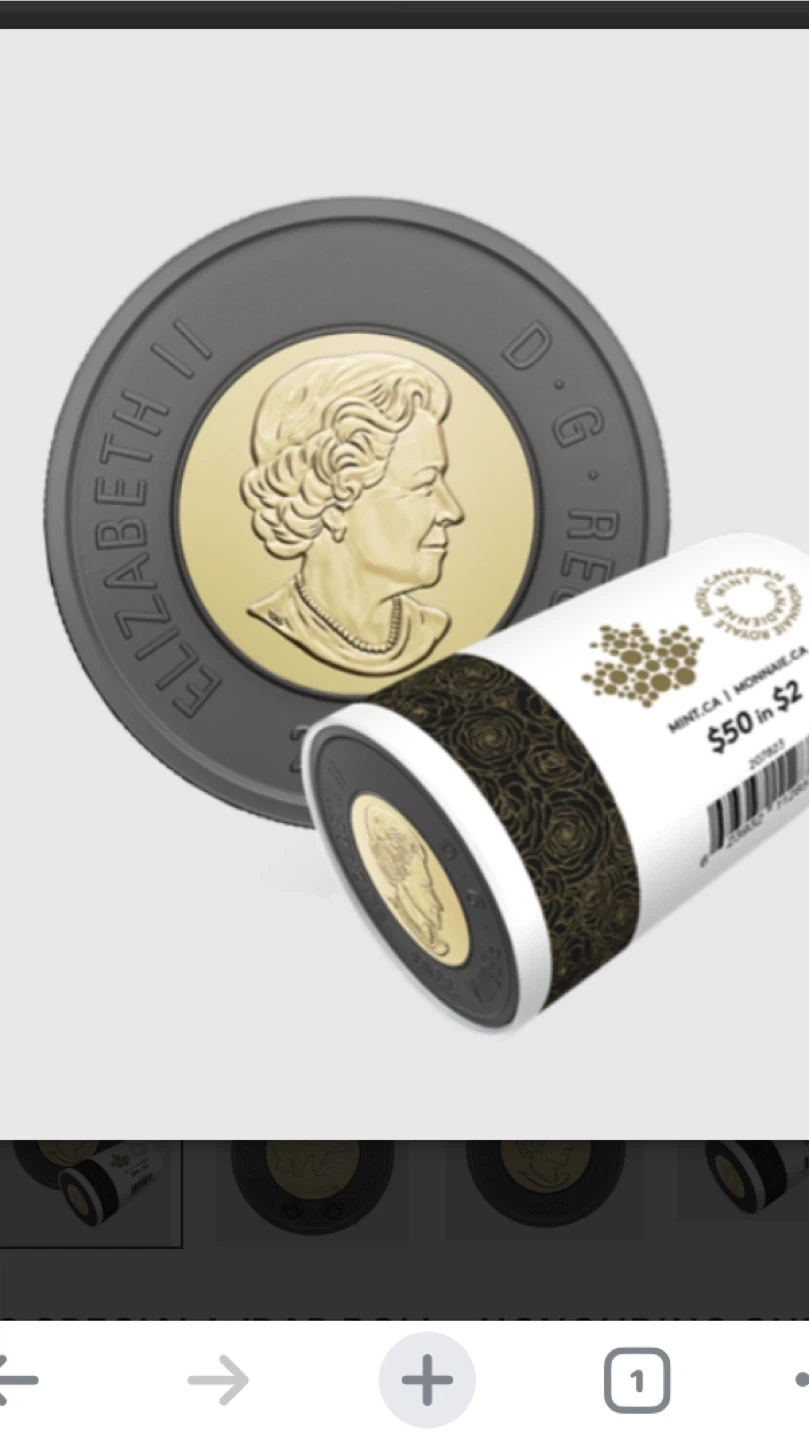 This is a roll of 25 Canadian $2 coins, valued at $50 total. It features Queen Elizabeth II on one side. The roll has a decorative floral pattern.
