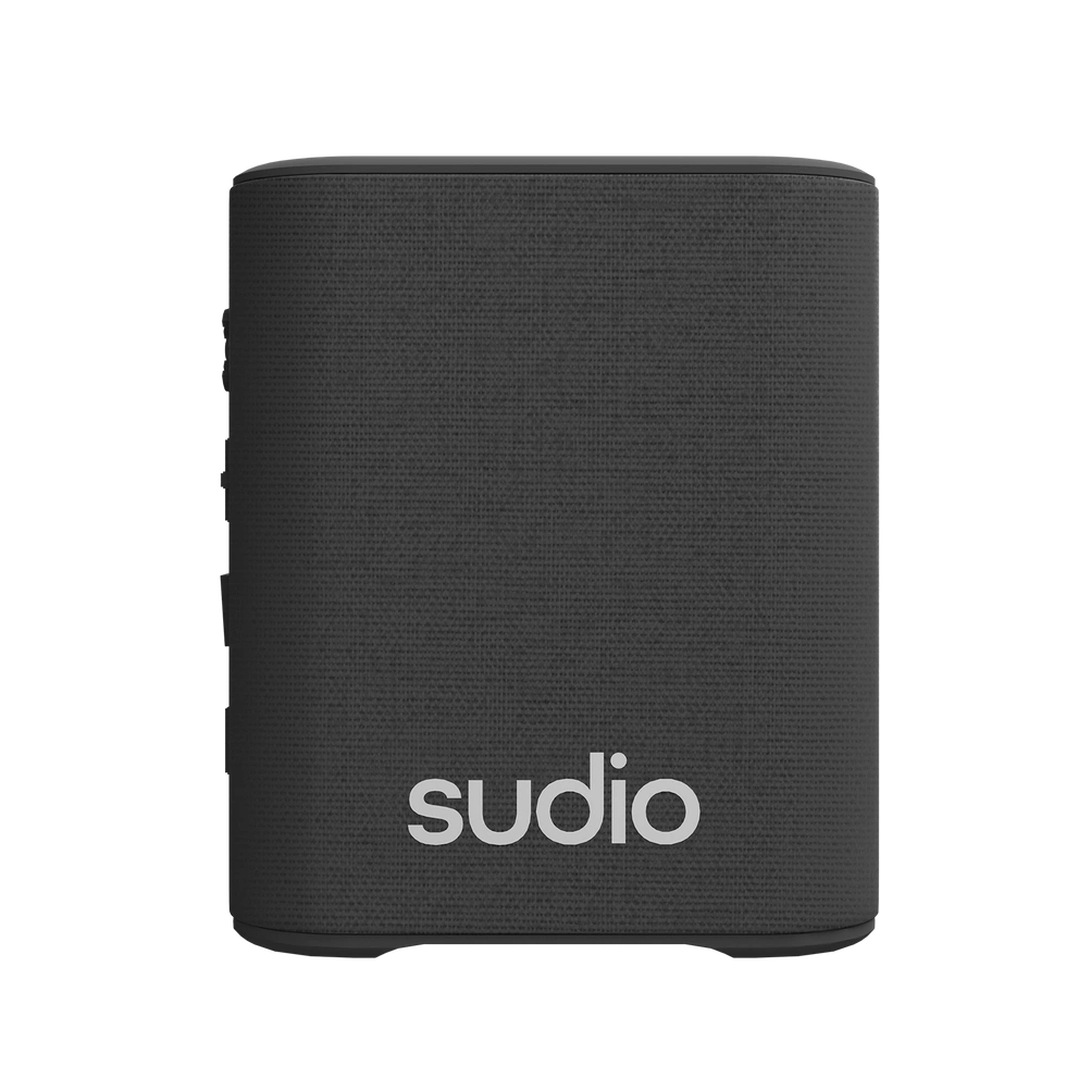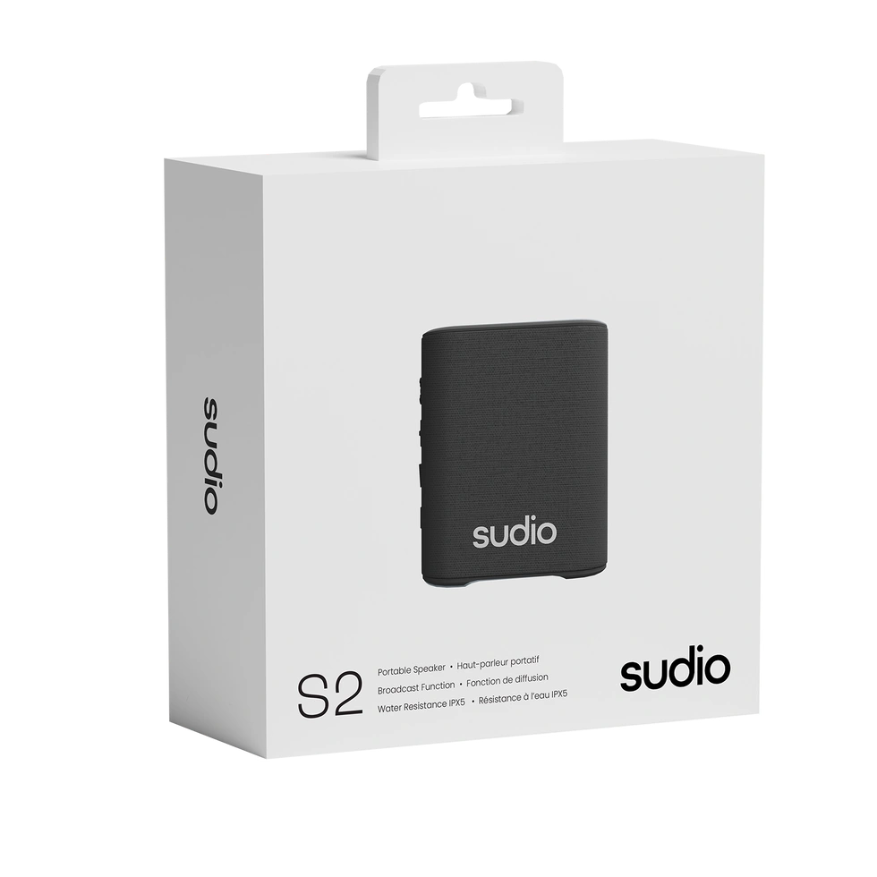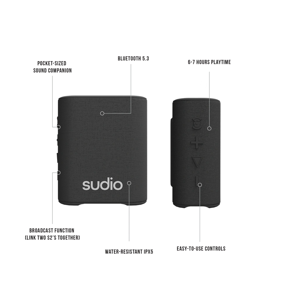 This is the Sudio S2 portable speaker. It's pocket-sized and features Bluetooth 5.3. Enjoy 6-7 hours of playtime with easy-to-use controls and IPX5 water resistance. It also has a broadcast function to link two S2s together!
