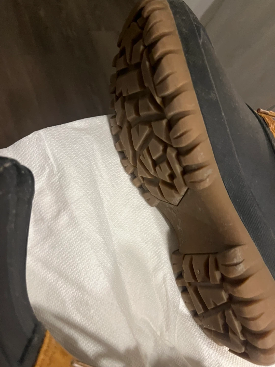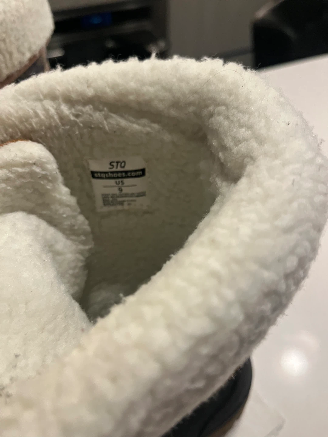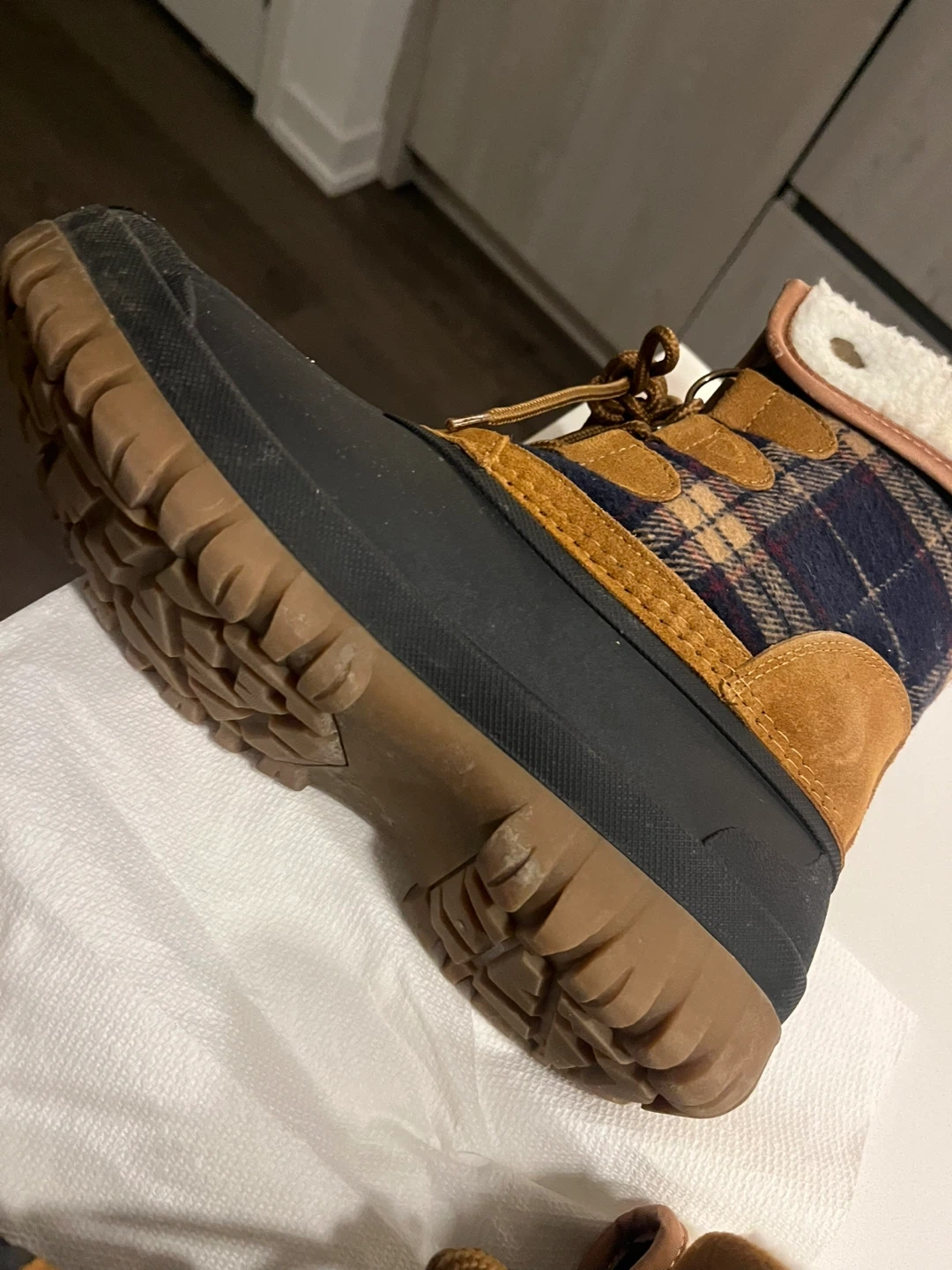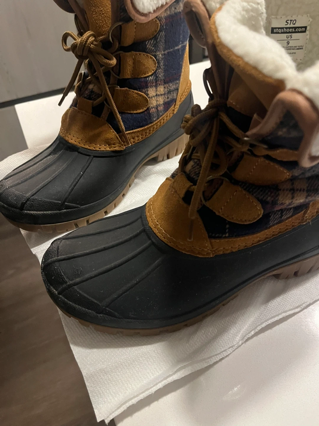Women's winter boots from STO. Features a plaid fabric shaft and sherpa lining. Rubber sole with lug treads. US size 9.