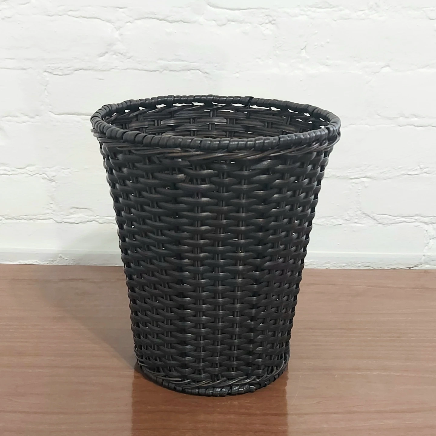 Tall resin wicker pattern basket, with metal inner frame. In excellent like-new pre-owned condition. Measures 10.5 inches tall, 9 inches wide across the top, and 6.75 inches wide across the bottom. From a pet free and smoke free home.